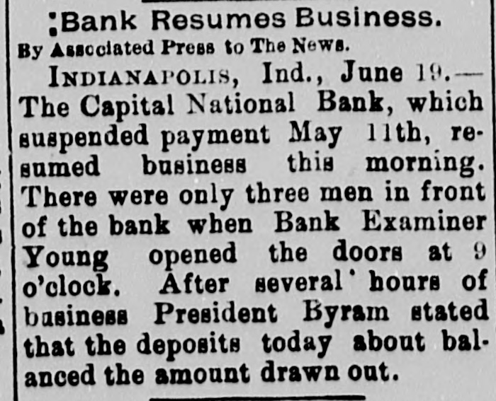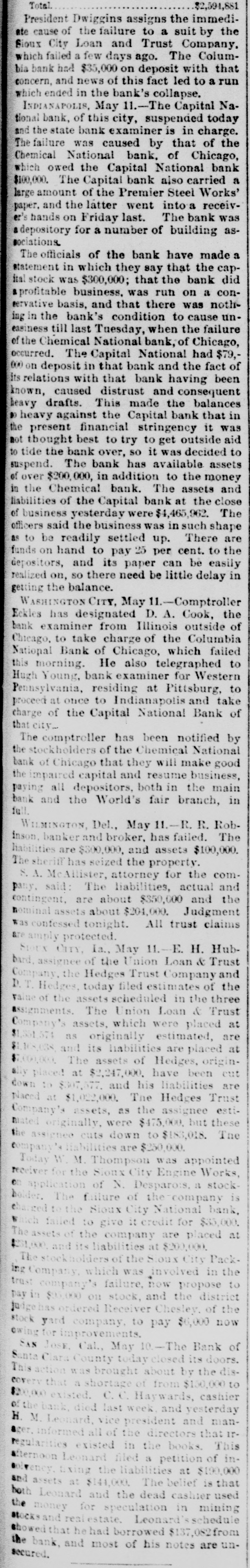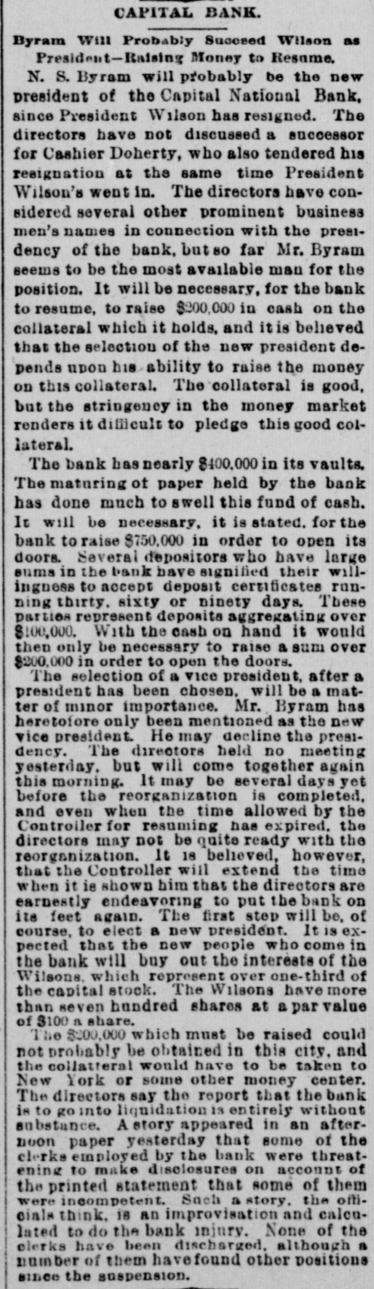 THE MONEY TRANSFERRED Otto Frenzel Goes to the Capital Bank and Demands Iron Hall Money. Receiver Failey Gives Him a Check on the Capital for $140,000-No Notification Had Been Given, but the Money WasThere. It is not very often that a man walks into a bank, without a moment's warning, in the busiest part of the day, and asks the paying-teller to cash a $140,000 check, but that is what was done at the Capital National Bank yesterday. The man with the check was Otto Frenzel, and the check was drawn by Receiver Failey, of the Iron Hall, and was for that order's funds which the Capital Bank held. Mr. Frenzel got the money in cold cash. It was three trips that the paying teller made to the big vault, and each time he would pile up greenback. in five-thousanddollar packages, on his arm like cord wood, and dump it on his desk. Mr. Frenzel was obliged to send for assistance to carry it to his bank, but it was gotten over without accident, and Receiver Failey has it where he can put his fingers on it. A Journal reporter called on President Wilson late last evening, and questioned him as to the occurrence. "The demand was wholly unexpected by us, but we were perfectly able to meet it," he said. I have talked to Mr. Failey but once since his appointment, and that was immediately after it. He said then that he should want to transfer the money some time, but that he could not tell how soon, and that he would letme know. We have had no word since, but have thought it best to be prepared." Wasn't it a very unusual proceeding, Mr. Wilson?" was asked. "Well. yes," and the banker smiled cautionsly. "It wasn't just exactly business courtesy, was it?" "No; I shouldn't have asked them for such a sum without first sending them word. and asking them if it were convenient for them to pay it, and I don't believe one banker in ten would have done it." "Would they have closed you up. if you hadn't happened to have the money?" "I've no doubt of it." Mr. Wilson went on to say that he was at the telier's window when Mr. Frenzel called for the money. and that he was of the opinion that Mr. Frenzel was considerably surprised when the money was counted out to him. He had no explanation to offer for such an action on the part of the Frenzel bank. but had all the appearances of a man well pleased with himself for having defeated a scheme that might have worked some harm to him. When the conversation turned on generalities he made the remark that it was very peculiar how John Frenzel tried to ride rough-shod over everyone, and then said: "Well, he never will over me." in a tone that said as plain as words: "And he didn't do it to-day." It could not be learned last night whether any of the Iron Hall's funds had been drawn from any of the other banks or not, but it 18 believed that there has not. Attorney Hawkins was seen by a reporter and was informed of the withdrawal of the money from the Capital Bank. He refused to believe it, and it was not until he was told that the reporter had conversed with President Wilson about it he reluctantly admitted its truth. He then expressed the profoundest surprise that such a thing had been done. "I am sure that I bad no knowledge of it, and from a less authentic source should most positively refuse to believe it. As attorneys we have no control over Receiver Failey, and I can give no explanation of the affair."