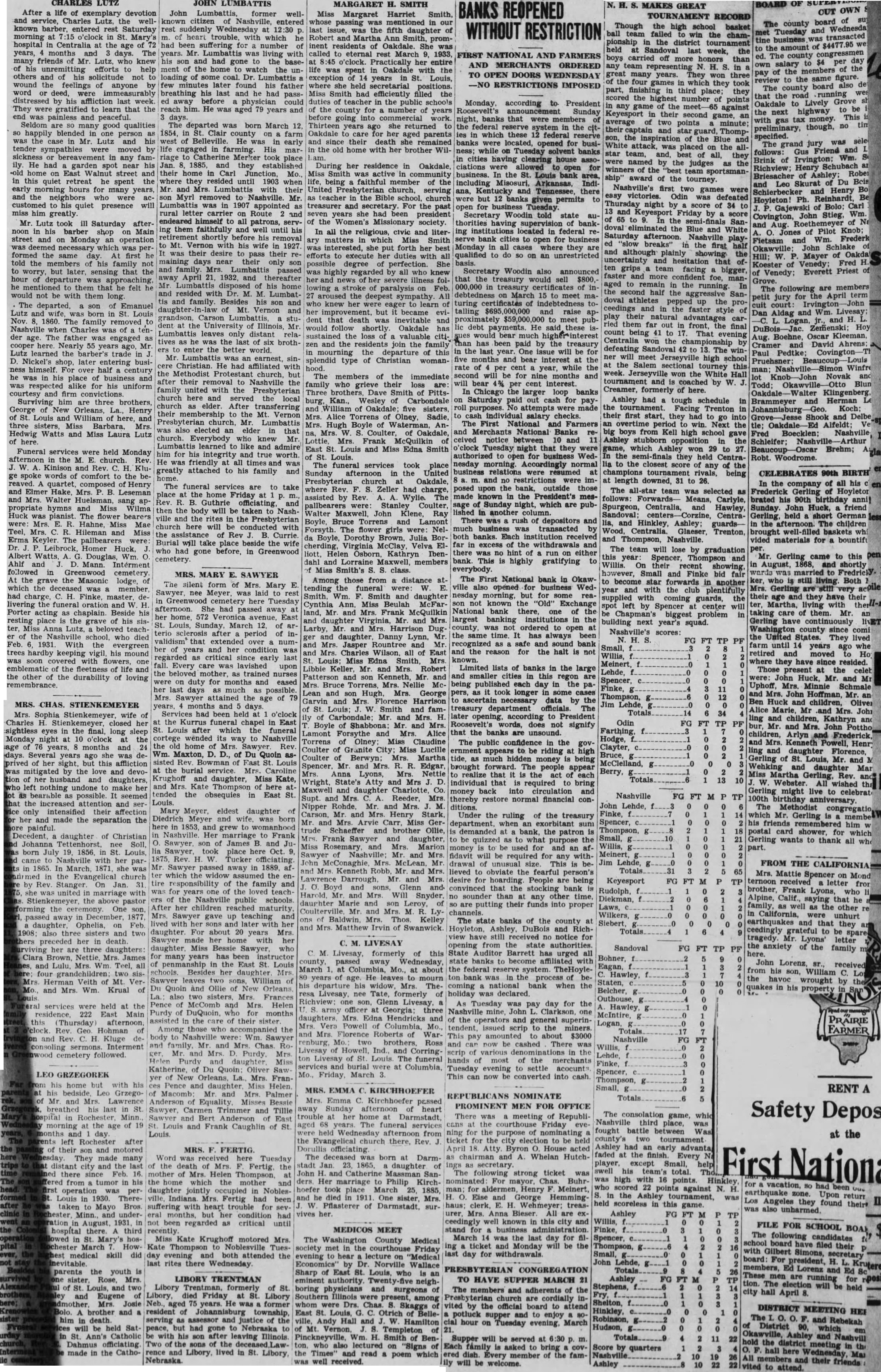 CHARLES LUTZ After life exemplary devotion Lutz, the wellknown entered rest Saturday morning at 7:15 o'clock in St. Mary's hospital Centralia at the age years, months and days. The many friends who knew his unremitting efforts to help others and of his solicitude not wound the feelings of by anyone word deed, were immeasurably distressed by his affliction last week. They were gratified to learn that the painless and peaceful. Seldom good qualities happily one person in Mr. Lutz and his tender by sickness in any ily. He had garden his street and this quiet retreat he spent the early for the neighbors who customed his quiet presence him greatly. Mr. Lutz took Saturday afterin barber Main street and on Monday operation which was performed the same first told the members his family not worry, but later, sensing that the hour approaching, mentioned them that he felt would with them long. The son of Emanuel Lutz and born in St. Louis Nov. 1860. family removed Nashville when Charles was tender The father was engaged cooper here. Nearly 55 years ago, Mr. learned the barber's trade Nickel's later entering busihimself. For over half century he was in his place of was alike for his uniform and firm three brothers, George New Orleans, Henry St. Louis William here, and three sisters, Miss Barbara, Mrs. Hedwig Watts Miss Laura Lutz here. Funeral services were held Monday the M. church. Kinison and Rev. H. Kluge spoke words comfort the bereaved quartet, composed Henry and Elmer Hake, Mrs. Leseman Mrs. Walter sang appropriate hymns Miss Wilma Huck was pianist. The flower bearers were: Mrs. Hahne, Miss Mae Teel, Mrs. Hileman and Miss Erma Keyler. The pallbearers were: Leibrock, Homer Huck, Albert Watts. Douglas, Wm. Ahlf D. Interment in Greenwood At the grave the Masonic lodge, which was member, had Finke, master, livering the oration and Porter acting chaplain. Beside his resting place the grave of his ter, Anna Lutz, teachthe school, who died Feb. With the evergreen hardby keeping vigil, his mound soon one the fleetness of life and the other of the durability of loving remembrance. MRS. CHAS. STIENKEMEYER Mrs. Sophia Stienkemeyer, wife Charles H. her sightless eyes in the final, long sleep Monday night at 10 o'clock age years, months and days. years ago she was deprived her sight, this affliction mitigated by the love and devoof her husband daughters, left nothing undone make her bearable possible. seemed the attention and seronly intensified their affection her and made the separation the painful. Decedent, daughter of Christian Johanna Tettenhorst, Soll, born July 19, 1856. St. Louis, came Nashville with her parin 1865. March, 1871, she Evangelical church by Rev. Stanger. On 31 united marriage with the pastor forming the One daughter. Ophelia, on Feb. and two her in death her are daughters: Clara James Lulu, Teel, all two sisVeith Mt. VerMrs. Wm. Krual of services were held the residence, 222 East Main this (Thursday) afternoon, Hohman and Rev H. Kluge consoling Interment cemetery followed. LEO GRZEGOREK his home but with his his Leo GrzegoMr. and Mrs. Lawrence breathed last St. ospital Rochester, Minn. the age of 19 left Rochester after their and motored They made many distant city and the last there since Feb. 16. from tumor in his operation Louis in 1930. Theretaken to Mayo Bros underAugust, hospital there. third St. Mary's hoschester March Howmedical skill did parents the youth Rose, Mrs. Louis, two and Eugene Josie brother and in will be held SatSt. Catholic Dahmus made in the Catho- JOHN LUMBATTIS John Lumbattis, former wellcitizen rest suddenly Wednesday at heart trouble, which had been suffering for number of years. was living with his and had gone the basement of the home watch the unloading of some coal. Dr. minutes later found his father breathing his last and he had passed away before physician could reach him. He was aged 79 years and days. was born March 12, 1854, in St. Clair farm He early life in His marriage Merker took place Jan. they established their home Carl Mo. where 1903 when Mr. and Lumbattis their son Myrl to Nashville. Mr. Lumbattis in 1907 appointed rural letter carrier on Route and himself to all patrons, them faithfully and well until shortly before his removal Mt. Vernon with his wife in 1927 was desire pass their maining days near their only son and family. Lumbattis passed April 1932, and thereafter Mr his resided with Dr. M. Lumbat tis and family. Besides his son Mt. Vernon Illinois, Mr. only he the last of six broththe Mr Lumbattis earnest, sinChristian had affiliated the Methodist church, their removal Nashville family united with the Presbyterian church here and served church elder. After transferring their membership the Mt. Vernon Presbyterian church, Mr. Lumbattis also elected an elder that church. Everybody knew Mr Lumbattis learned like and admire for his integrity true worth. He friendly all was greatly attached to his family and The funeral services are to take place the home Friday Rev. Guthrie and then the body will be taken Nashville the rites the be conducted with the Rev Currie. Burial will take place beside the wife who had gone before, in Greenwood cemetery. MRS. MARY E. SAWYER The silent form of Mrs. Mary nee Meyer, laid Tuesday afternoon. She had passed away her home, 572 Veronica avenue, East St. Louis, Sunday, March 12, arterio sclerosis after period of invalidism that extended over number of condition regarded critical since early last fall. Every care lavished upon the beloved trained nurses on duty for months and eased possible. Mrs. attained the of and days had been held o'clock the funeral in East Louis after which the funeral cortege wended its Nashville the home Mrs. Rev Maxton, of Du Quoin assisted East the burial service. Caroline Krughoff and daughter, Miss Kate, and Kate Thompson here tended the obsequies East Louis. Mary Meyer, eldest daughter Diedrich Meyer and wife, born here 1853 and grew womanhood Nashville marriage Frank Sawyer s