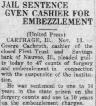 JAIL GVEN CASHIER FOR EMBEZZLEMENT (United Press) CARTHAGE, Nov. George Cachroth, cashier the closed First Trust and Savings bank of Nauvoo, guiltoday to counts of forgery in connection the suspension of the instituwas sentenced to one to years the state prison the forgery counts and one 10 years the embezzlement charges.