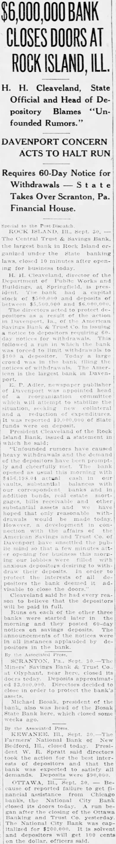 ROCK H. H. Cleaveland, State Official and Head of Depository Blames founded Rumors." DAVENPORT CONCERN ACTS TO HALT RUN Requires Notice for Takes Scranton, Pa. Financial House. The Central Trust & Savings Bank. the largest bank in Rock Island ganized under the State laws, closed 10 minutes after ing for business today H. H. director Department of Public Works and Buildings, at ident. bank had capital of and deposits of and protect result Trust in notice to depositors requiring day notices for This followed the bank forced limit to Today large crowd bank filing The the largest bank in Davenport. publisher Davenport appointed head committee attempt to stabilize situation, collateral and reduction reported of State funds were on deposit. President Cleaveland of the Rock Island Bank, issued statement which he rumors caused and the demand of the depositors promptand cheerfully The bank opened usual this morning with actual cash in balances banks and addition bonds, real mortbills receivable and other substantial assets and have hoped that reasonable drawals would be made today. nection the affairs of the Trust the mind that few opening for business this ing our lobbies filled desiring to draw their In order protect of all positors bank deemed it visable close the doors. Cleaveland he had every to that the depositors be paid in full. Runs on of the other three banks later the morning and they posted 60-day notices on savings deposits. The the in all instances applauded by positors in the bank. Sept Miners' Bank & Trust Co. near closed its Deposits approximatDirectors decided to in order to protect the bank's Michael Bosak. president of the also was head of the Bosak Bank here. which closed some the Press Sept. Farmers' National Bank of New Bedford, 111., closed today President R. Spratt said directors the action for the best interof depositors and that the bank expected to satisfy all demands. Deposits $90,000. Sept. Because of reported failure to get nancial assistance from Chicago the National City Bank closed its doors today. run after the closing of the Ottawa Banking and Trust yesterday. The National City Bank capitalized for It is solvent and depositors will get 100 cents on the dollar. officers said.