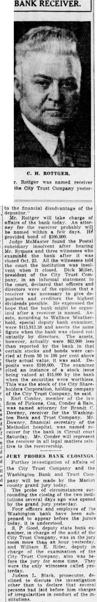 BANK RECEIVER. to the financial disadvantage of the Mr. Rottger will take charge of affairs the bank today ney for the receiver probably named within few days. provided bond of Judge McMaster found the Postal subsidiary insolvent after hearing Mr. three examined the bank after it was closed Oct. 23. All told the court the institution was insolvent when closed. Dick Miller, president of the City Trust Company, in an informal statement to the court, declared that officers and directors the that receiver was necessary to give depositors and creditors the highest dividends possible. He the hope that the bank might be organized after receiver is named. Asaccording to Wallace Weatherhold, special deputy bank examiner, were $415,913 assets the same figure bank closed voluntarily by directors. The assets, however, actually were $62,000 than reported by the bank in that certain stocks and bonds were carried 50 to 100 per cent above their actual value, said. Deposits were $340,000. The examiner cited an instance stock issue being valued $15,000 by the bank when the securities were worthless. This was the stock of the City Shareholders Corporation, holding company of the City Trust Company, he Earl Conder, member the law firm of Pickens, Cox, Conder & Bain, named attorney for Brandt Downey, receiver for the Washington Bank and Trust Company. Mr. Downey, financial secretary of the Methodist hospital, was ceiver the Circuit court Saturday Mr. Conder will represent the all legal matters relative to the receivership.