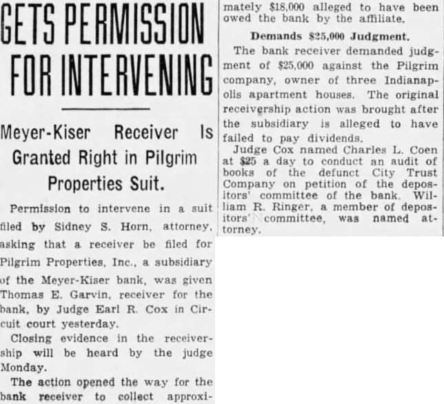 Permission to intervene in suit filed by Sidney S. Horn, attorney. asking that receiver be filed for Pilgrim Properties. Inc., subsidiary of the Meyer-Kiser bank, was given Thomas E. Garvin, receiver for the bank. by Judge Earl R. Cox in Circuit court yesterday. Closing evidence in the receivership will be heard by the judge Monday. The action opened the way for the bank receiver to collect approxi- mately $18,000 alleged to have been owed the bank by affiliate. Demands $25,000 Judgment. The bank judgment of $25,000 against the Pilgrim company, owner of three Indianapolis apartment houses. The original receivership action was brought after the subsidiary alleged to have failed to pay dividends Judge Cox named Charles Coen at $25 day to conduct an audit of books of the defunct City Trust Company on petition of the depositors' committee of the bank William R. Ringer, member deposcommittee, was named attorney