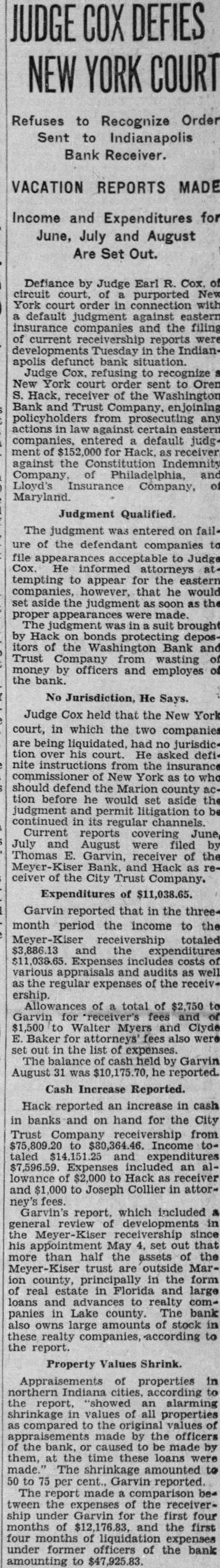 Judge Cox held that the New York court, in which the two companies are being liquidated, had no jurisdicasked definite instructions from the insurance commissioner New York as to who should defend the Marion county tion before he would aside the judgment and permit continued in Current reports July August were Thomas Garvin, receiver the Hack ceiver the City Trust Company. Expenditures of $11,038.65.