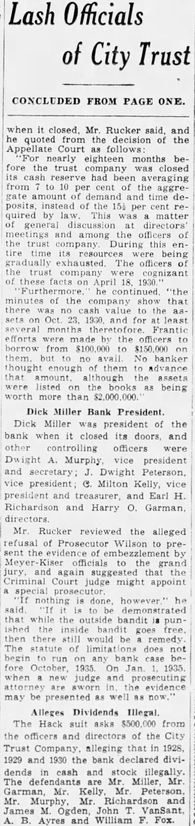 Dick Miller Bank President Dick Miller was president of the bank when it closed its doors, and other controlling officers were Dwight A. Murphy, vice president and secretary J. Dwight Peterson. vice president C. Milton Kelly, vice president and treasurer and Earl H. Richardson and Harry O. Garman, Mr Rucker reviewed the alleged refusal of Prosecutor Wilson to present the of by Meyer Kiser officials to the grand jury, and again suggested that the Criminal Court judge might appoint special nothing he it be demonstrated that while the bandit punished inside bandit goes free then there would be remedy The statute of not begin to run any bank case fore On when judge and prosecuting sworn the evidence may be presented as well as now.
