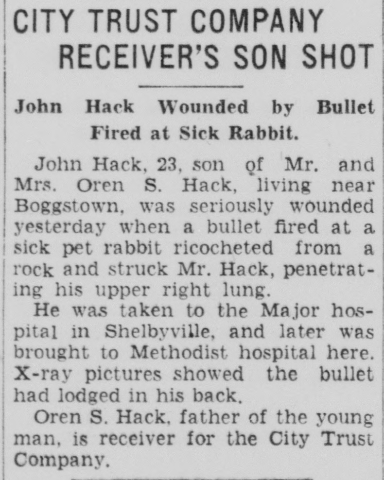 John Hack, 23, son of Mr. and Mrs. Oren S. Hack, living near Boggstown, was seriously wounded yesterday when a bullet fired at a sick pet rabbit ricocheted from a rock and struck Mr. Hack, penetrating his upper right lung.