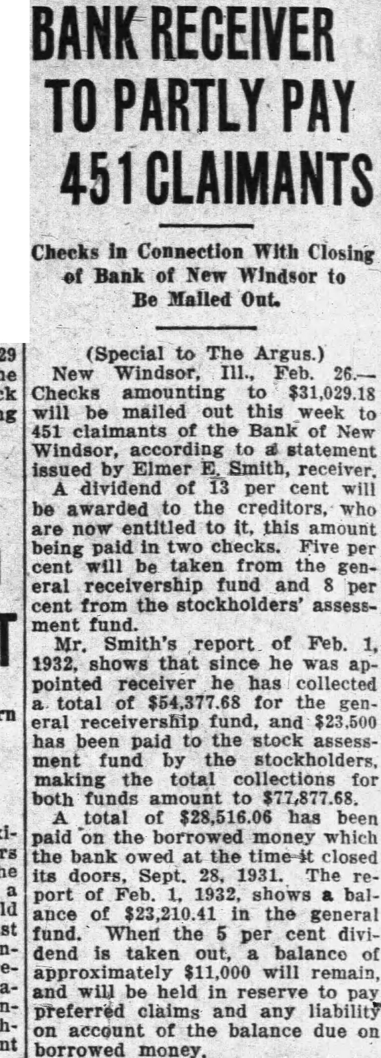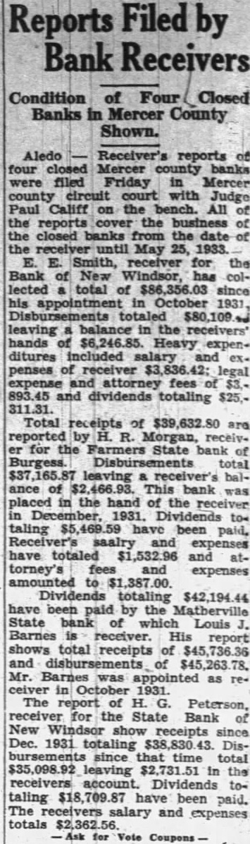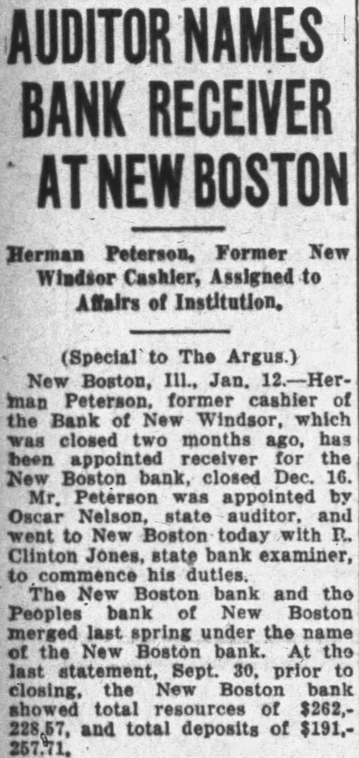 BANK RECEIVER Herman Peterson, Former New Windsor Cashier, Assigned to Affairs of Institution. (Special to The Argus.) New Boston, III., Jan. man former cashier of the Bank of New Windsor, which closed two months ago, has been appointed receiver the New Boston bank, closed Dec. 16. Mr. Peterson appointed Oscar Nelson, state auditor, and went to New Boston today with R. Clinton Jones, state bank examiner, commence his duties. The New Boston bank and the Peoples bank New Boston merged last spring under the name the New Boston bank. At the last statement, Sept. 30, prior to New Boston bank showed total resources of $262,228,57, and total deposits of $191,257.71,