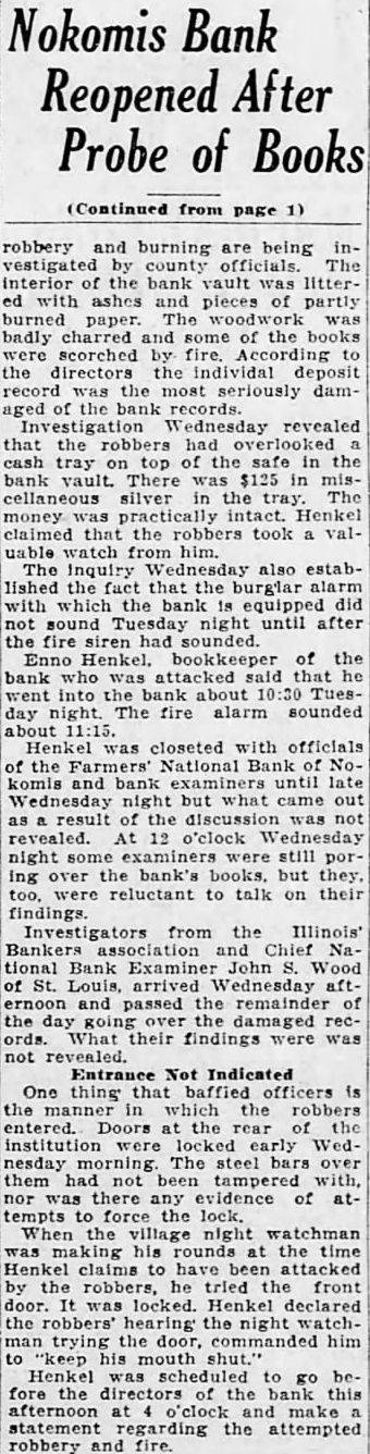 Nokomis Bank Reopened After Probe of Books (Continued from page 1) robbery and burning are being investigated by county officials. The interior the bank vault was littered with ashes and pieces of partly burned paper. The badly charred and some of the books were scorched the directors the individal deposit record was the seriously damaged of the records. Investigation Wednesday revealed that the robbers had cash tray on top of the safe in the bank vault. There was $125 in miscellaneous silver in the tray. The money practically intact. Henkel claimed that the robbers took valuable watch from him. The inquiry Wednesday also established the fact that the burglar alarm with which the equipped did not sound night until after the fire siren had sounded. Enno Henkel. bookkeeper of the bank who was attacked said that went into the bank about Tuesday night. The fire alarm sounded about 11:15. Henkel was closeted with officials of the Farmers' National Bank Nokomis bank examiners until late Wednesday night but came out as result of the discussion was revealed. At 12 o'clock Wednesday night examiners were still por ing over the bank's books, but they, too, were reluctant to talk on their findings. Investigators from the Illinois' Bankers and Chief National Bank Examiner John Wood of St. Louis, arrived Wednesday aftand passed the remainder of the day going over damaged records. What their findings were was not revealed. Entrance Not Indicated One thing that baffied officers is the manner in which the robbers entered. Doors rear of the institution locked early Wednesday The steel bars them had been tampered with, was there any evidence of attempts force the lock. When the village night watchman was his rounds at the time Henkel claims to have been attacked by the robbers, he tried the front door. It was locked. Henkel declared the robbers' hearing the night watchtrying the door, commanded him to "keep his mouth shut." Henkel was scheduled to go before the the bank this afternoon at and statement the attempted robbery and fire.