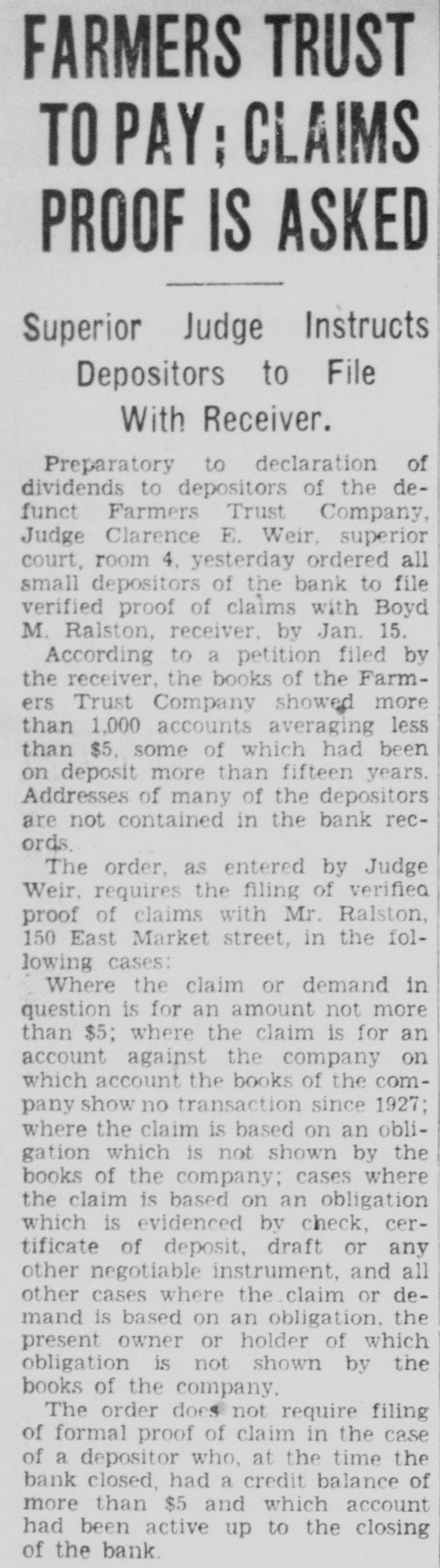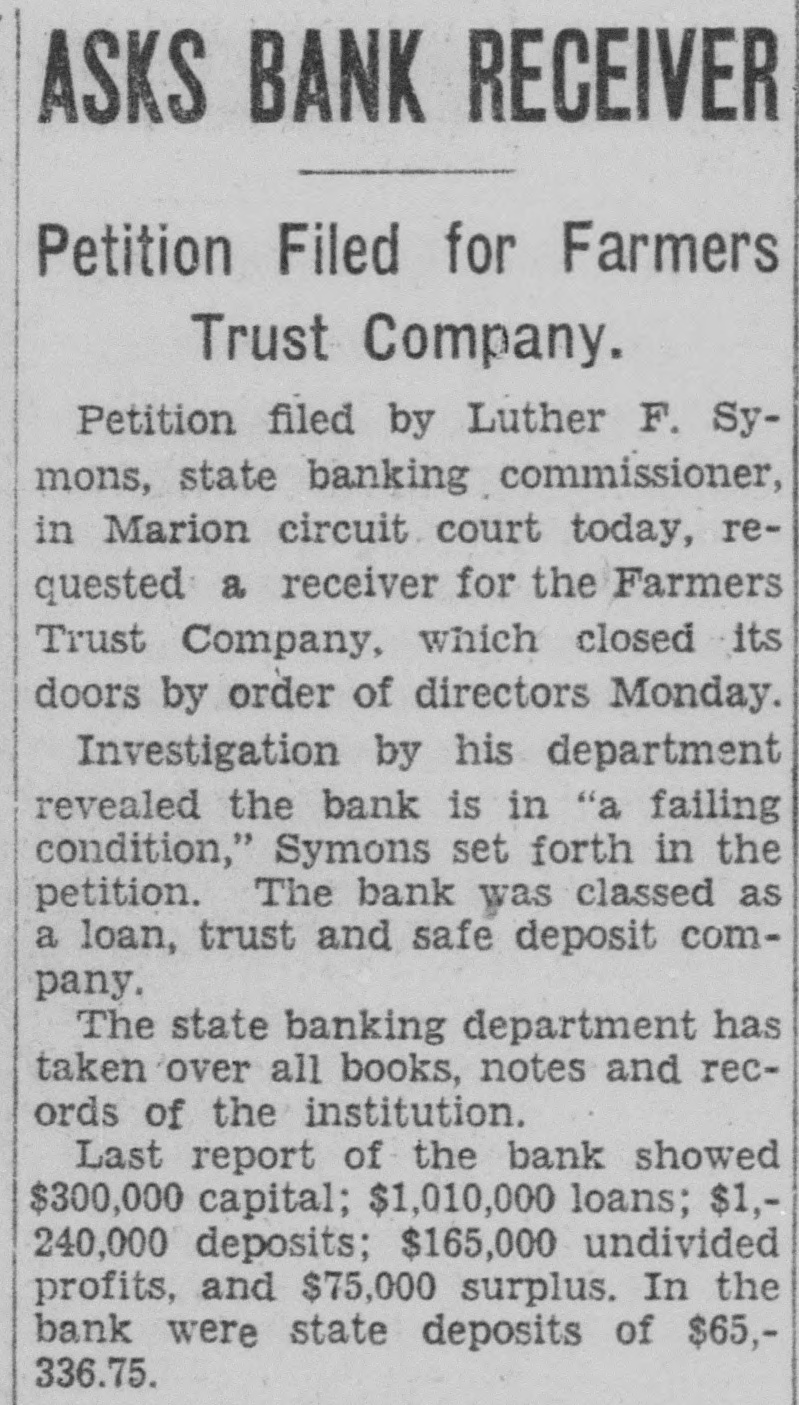 FARMERS TRUST CLOSES DOORS TEMPORARILY Bank Is Not Insolvent, Statement by Board Declares. State banking department today closed doors of the Farmers Trust Company, 150 East Market street, on request of directors of the institution, for refinancing and reorganization. Thomas Barr, assistant state bank commissioner. took charge of the bank and J. W. Parrett, state banking department examiner, was working in the institution. The closing is temporary, according to James W. Noel, attorney director of the bank. Depositors Are Safe The trust company is not insalvent, a statement by directors declared, adding, "there is no doubt in the minds of the board that depositors will lose nothing and that stockholders will, even in the event of liquidation, receive large distri-, bution on their stock." Last report of the bank showed capital of $300,000; loans, $1,010,000; deposits, $1,240,000; undivided profits, $165,000, and surplus, $75,000; The state had deposits totaling $65,336.75 in the institution. C. N. Williams is president. Shortly after the Washington Bank and Trust Company closed last fall, the Farmers Trust Company invoked a ninety-day call on time deposits. Statement Is Issued Directors of the institution issued the following statment after closing today: "By action of the board of directors, the banking commissioner has been requested to take temporary charge of the affairs of the Farmers Trust Company, with a view to refinancing, reorganization or segregation of its banking business from its mortgage loan and trust business. "The trust company is not insolvent, and there is no doubt in the minds of the board that depositors will lose nothing and that stockholders will, even in the event of liquidation, receive large distribution on their stock. "The immediate cause of the foregoing action is the lack of liquid operating capital necessary to take care of the anticipated demands of depositors and at the same time to carry on the mortgage business in the manner in which it has heretofore been done. "In view of the foregoing, it was the opinion of the directors that temporary suspension will be to the advantage, not only of the depositors, but of the stockholders."