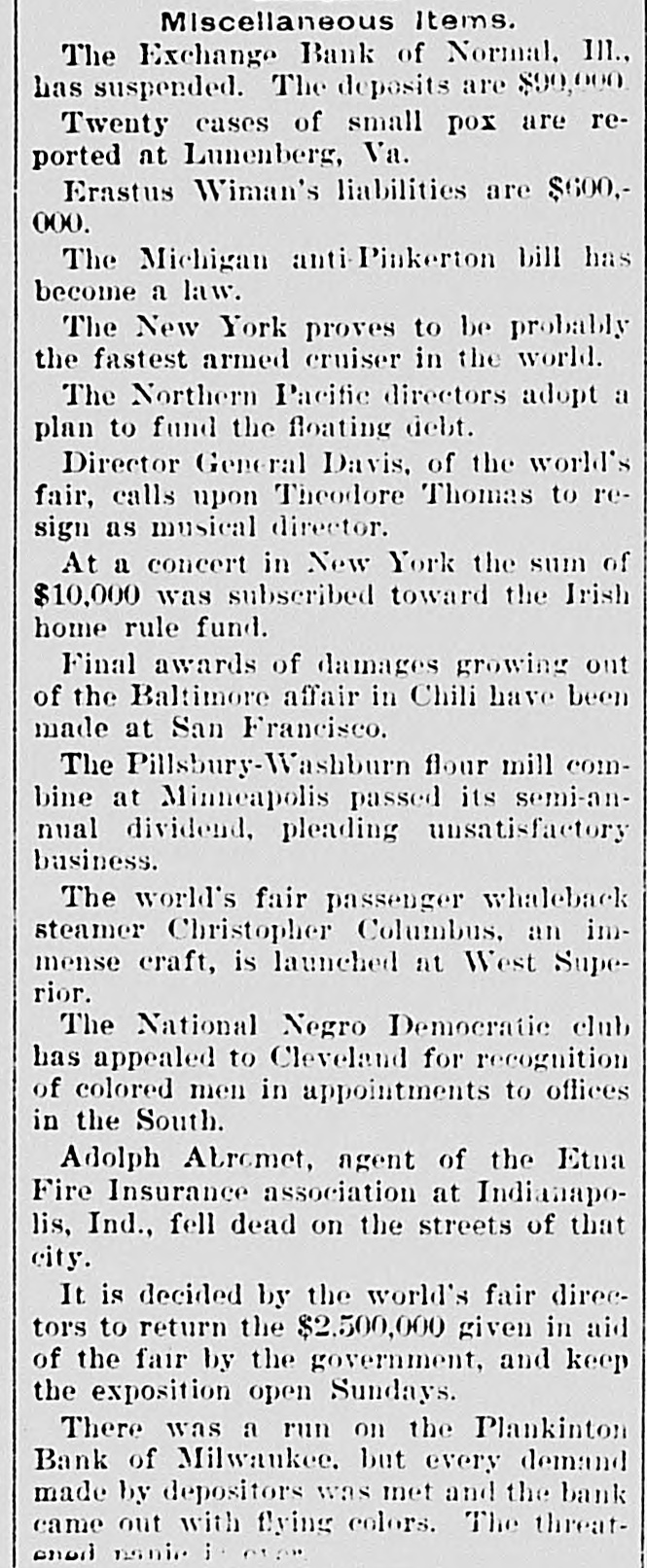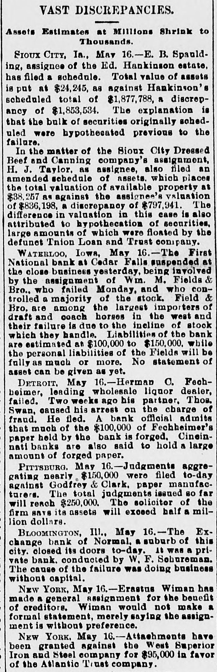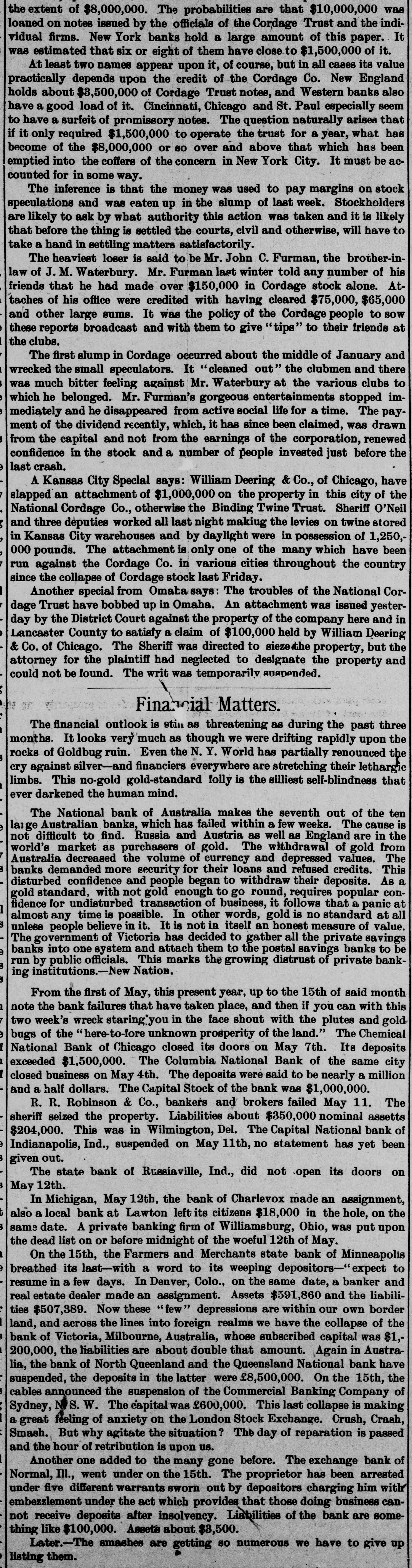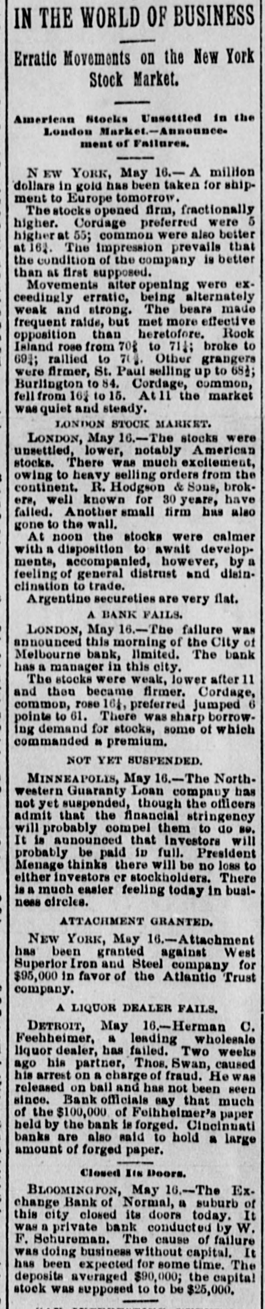 IN THE WORLD OF BUSINESS Erratic Movements on the New York Stock Market. American Stocks Unsettled in the London Market-Announce. ment of Failures. N EW YORK, May 16.- A million dollars in gold has been taken for shipment to Europe tomorrow. The stocks opened firm, fractionally higher. Cordage preferred were 5 higher at 55; common were also better at 161. The impression prevails that the condition of the company is better than at first supposed. Movements after opening were exceedingly erratic, being alternately weak and strong. The bears made frequent raids, but met more effective opposition than heretofore. Rock Island rose from 70% to 711; broke to 691; railled to 70. Other grangers were firmer, St. Paul selling up 683; Burlington to 84. Cordage, common, fell from 16 to 15. Atli the market quiet and steady. LONDON STOCK MARKET. LONDON, May 16.-The stocks were unsettled, lower, notably American stocks. There was much excitement, owing to heavy selling orders from the continent. R. Hodgson & Sons, brokere, well known for 30 years, have failed. Another small firm has also gone to the wall. At noon the stocks were calmer with a disposition to await developments, accompanied, however, by feeling of general distrust and disinclination to trade. Argentine secureties are very flat. A BANK FAILS. LONDON, May 16.-The failure was announced this morning of the City of Melbourne bank, limited. The bank has a manager in this city. The stocks were weak, lower after 11 and then became firmer. Cordage, common, rose 161, preferred jumped 6 pointe to 61. There was sharp borrowing demand for stocks, some of which commanded is premium. NOT YET SUSPENDED. MINNEAPOLIS, May 16.-The Northwestern Guaranty Loan company has not yet suspended, though the officers admit that the financial stringency will probably compel them to do so. It is aunounced that Investors will probably be paid in full. President Menage thinks there will be no loss to either investors er stockholders. There is a much easier feeling today in bustness circles. ATTACHMENT GRANTED. NEW YORK, May 16.-Attachment has been granted against West Superior Iron and Steel company for $95,000 in favor of the Atlantic Trust company. A LIQUOR DEALER FAILS. DETROIT, May 16.-Herman C. Feehheimer, a leading wholesale liquor dealer, has failed. Two weeks ago his partner, Thos. Swan, caused his arrest on a charge of fraud. Hewas released on ball and has not been seen since. Bank officials say that much of the $100,000 of Feihheimer's paper held by the bank is forged. Cincinuati banks are also said to hold a large amount of forged paper. Closed Its Doors. BLOOMINGTON, May 16.--The Exchange Bank of Normal, is suburb of this city closed its doors today. It was a private bank conducted by W. F. Schureman. The cause of failure was doing business without capital. It has been expected for some time. The deposits averaged $90,000; the capital stock was supposed to to be $25,000.