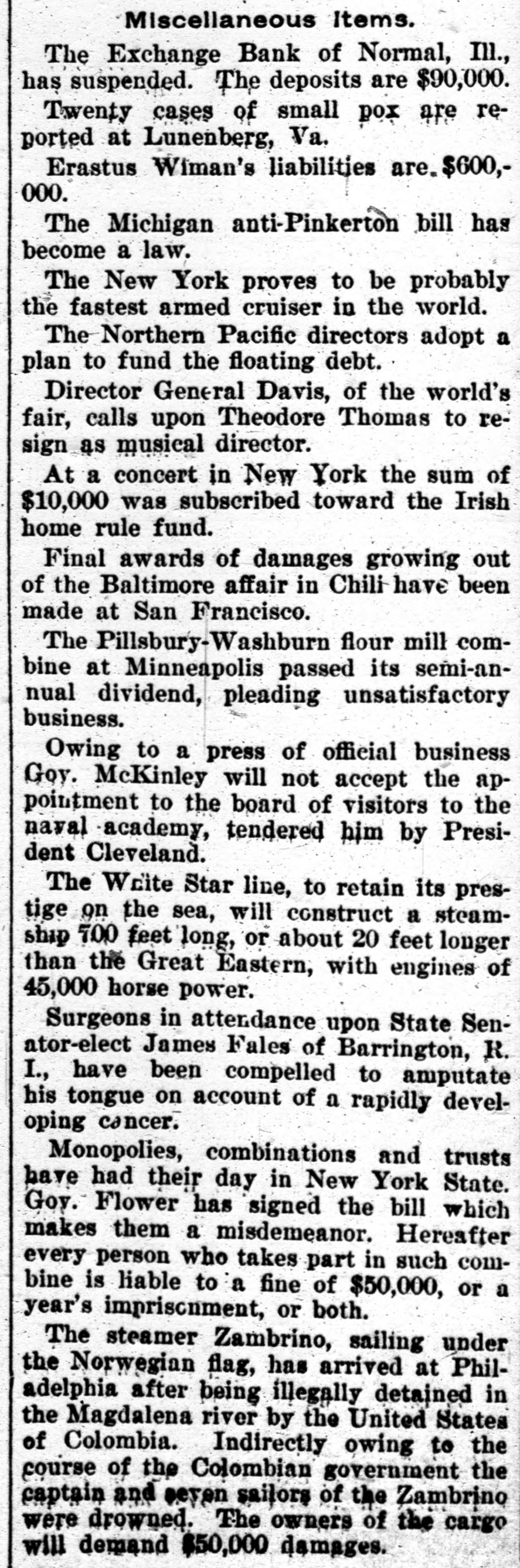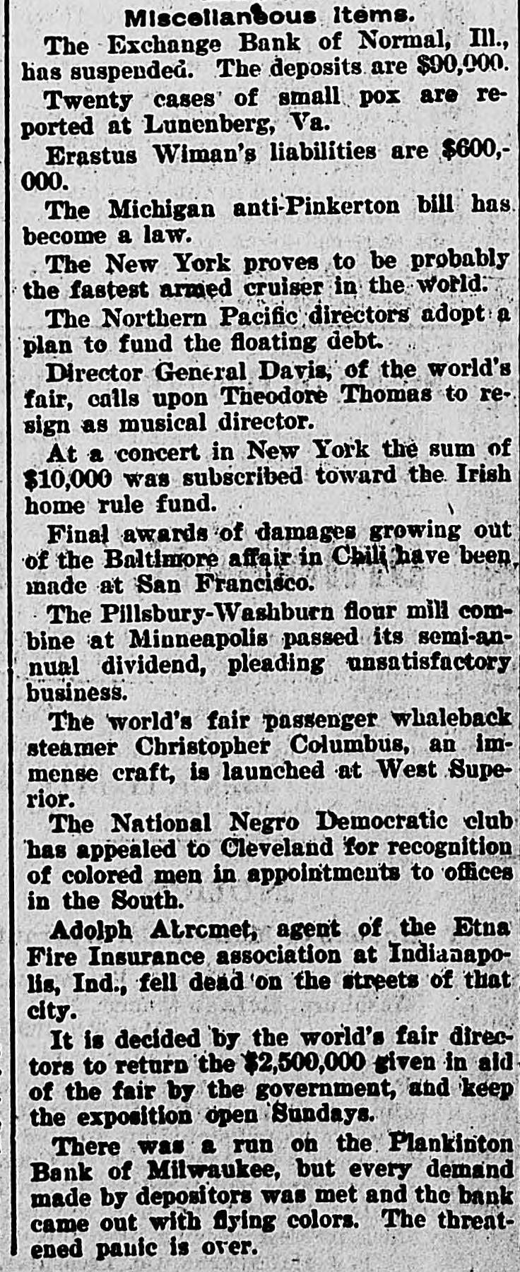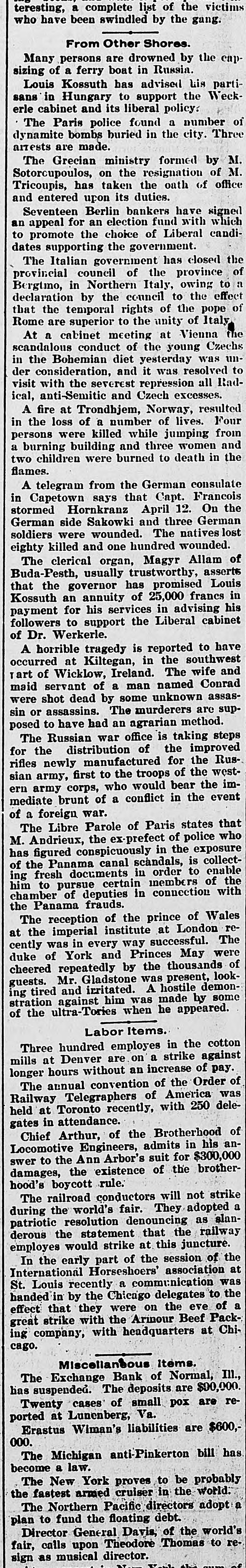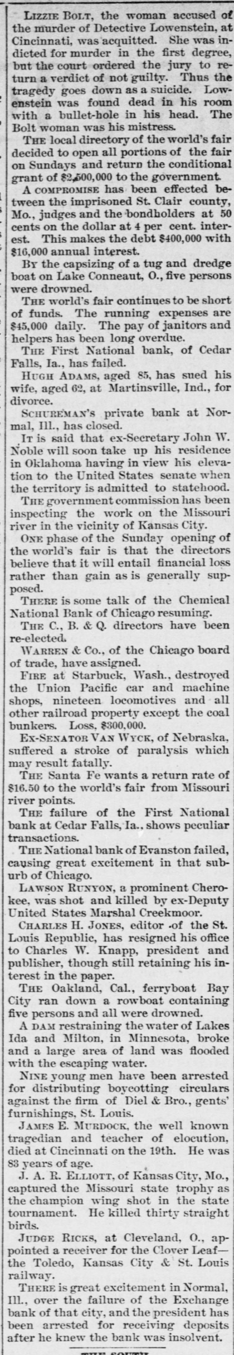 IN THE WORLD OF BUSINESS Erratic Movements on the New York Stock Market. American Stocks Unsettled in the London Market-Announce. ment of Failures. N EW YORK, May 16.- A million dollars in gold has been taken for shipment to Europe tomorrow. The stocks opened firm, fractionally higher. Cordage preferred were 5 higher at 55; common were also better at 161. The impression prevails that the condition of the company is better than at first supposed. Movements after opening were exceedingly erratic, being alternately weak and strong. The bears made frequent raids, but met more effective opposition than heretofore. Rock Island rose from 70% to 711; broke to 691; railled to 70. Other grangers were firmer, St. Paul selling up 683; Burlington to 84. Cordage, common, fell from 16 to 15. Atli the market quiet and steady. LONDON STOCK MARKET. LONDON, May 16.-The stocks were unsettled, lower, notably American stocks. There was much excitement, owing to heavy selling orders from the continent. R. Hodgson & Sons, brokere, well known for 30 years, have failed. Another small firm has also gone to the wall. At noon the stocks were calmer with a disposition to await developments, accompanied, however, by feeling of general distrust and disinclination to trade. Argentine secureties are very flat. A BANK FAILS. LONDON, May 16.-The failure was announced this morning of the City of Melbourne bank, limited. The bank has a manager in this city. The stocks were weak, lower after 11 and then became firmer. Cordage, common, rose 161, preferred jumped 6 pointe to 61. There was sharp borrowing demand for stocks, some of which commanded is premium. NOT YET SUSPENDED. MINNEAPOLIS, May 16.-The Northwestern Guaranty Loan company has not yet suspended, though the officers admit that the financial stringency will probably compel them to do so. It is aunounced that Investors will probably be paid in full. President Menage thinks there will be no loss to either investors er stockholders. There is a much easier feeling today in bustness circles. ATTACHMENT GRANTED. NEW YORK, May 16.-Attachment has been granted against West Superior Iron and Steel company for $95,000 in favor of the Atlantic Trust company. A LIQUOR DEALER FAILS. DETROIT, May 16.-Herman C. Feehheimer, a leading wholesale liquor dealer, has failed. Two weeks ago his partner, Thos. Swan, caused his arrest on a charge of fraud. Hewas released on ball and has not been seen since. Bank officials say that much of the $100,000 of Feihheimer's paper held by the bank is forged. Cincinuati banks are also said to hold a large amount of forged paper. Closed Its Doors. BLOOMINGTON, May 16.--The Exchange Bank of Normal, is suburb of this city closed its doors today. It was a private bank conducted by W. F. Schureman. The cause of failure was doing business without capital. It has been expected for some time. The deposits averaged $90,000; the capital stock was supposed to to be $25,000.