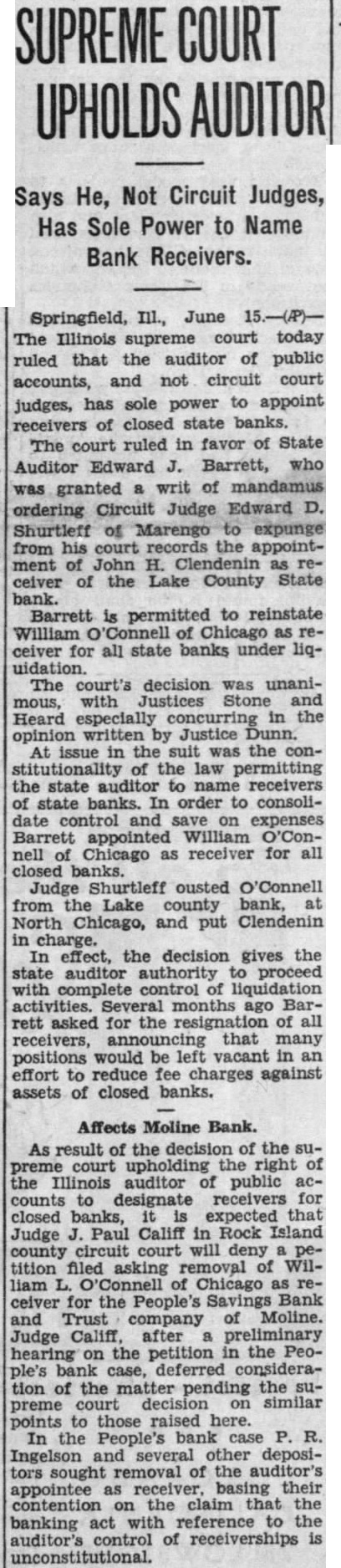 Springfield, Ill., June The Illinois supreme court today ruled that the auditor of public and not circuit court accounts, has sole to appoint judges, power closed state banks. receivers of ruled in favor of State The court Auditor Edward Barrett, who granted writ of mandamus ordering Circuit Judge Edward Shurtleff Marengo expunge from his court records the appointment John Clendenin receiver of the Lake County State bank. Barrett is permitted to reinstate William Connell of Chicago as ceiver for all state banks under liquidation. The court's decision was unanimous, with Justices Stone and Heard especially concurring in the opinion Justice Dunn. issue the suit was the conof the law permitting the state auditor name receivers state banks. In order to consolicontrol and on expenses Barrett appointed William nell Chicago as receiver for all closed banks. Judge Shurtleff ousted O'Connell from the Lake county bank, at North Chicago, and put Clendenin in charge. In effect, the decision gives the state auditor authority proceed with complete control months rett asked for the resignation receivers, announcing that many would be vacant in positions effort to reduce fee charges against assets of closed banks.