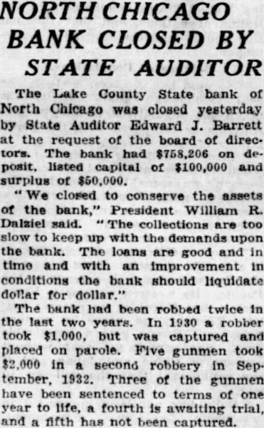 The Lake County State bank of North Chicago was closed yesterday by State Auditor Edward J. Barrett at the request of the board of directors. The bank $758,206 on deposit, listed capital of $100,000 and surplus of $50,000. We closed to conserve the assets of the bank," President William R. Dalziel said. collections are too slow keep up with the demands the bank. The loans are good and in time and with an improvement in conditions the bank should liquidate dollar for The bank had robbed twice in the last two In 1930 robber took but was captured and placed on parole. Five gunmen took $2,000 in in Sep. tember, 1932. Three of the gunmen have sentenced to terms of one year to life, fourth is awaiting trial, and fifth has not been captured.