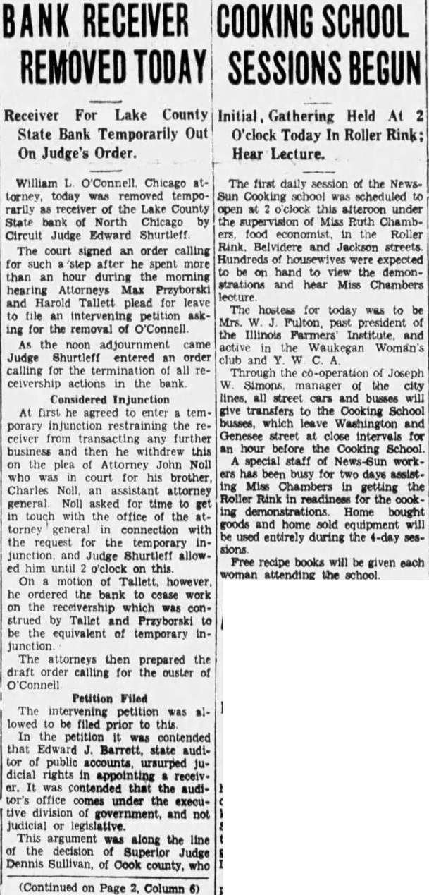 After a long and tedious wait by the depositors, the Lake Coun ty State Bank at North Chicago, which went into receivership sev eral months before the date in May; 1933, on which the Peoples Bank, of Belvidere, was taken over by the Farmers State Bank will pay its first dividend Announcement was made by Receiver W. L. O'Connell that the clos ed institution will parcel out the small dividend of 10 per cent. It. will be recalled that the Lake County State Bank furnished the test case to determine thright of State Auditor Barrett to name receivers for all closel state banking institutions. The stockholders and depositors wan ed to name a local man of their own choice and Judge Shurtleff upheld their contention. The argued that a politically appoint ed receiver would pay himself and his lawyers excessive fees and would delay payments to the depositors. While the Illinois supreme court upheld the law placing all state bank receiverships under the control of the state auditor the depositors are now saying, "we told you so." The litigation over the receivership question indirectly proved of considerable benefit to depositors and stockholders of the Peoples Bank of Belvidere. Judga Shurtleff's decision, holding the law unconstitutional, automatic ally prevented State Auditor Barrett from further appointment, of political bank receivers until the case could reach the supreme court. This delay gave the stockholders and depositors of the Peoples Bank time to protect their interests in the action subsequently taken and resulted in an immediate cash payment to all depositors of 70 per cent with full assurance of receiving the remaining 30 per cent at the end of a three-year period. The Belvidere bank case is said to be the only one in the United States, under similar circum stances, to hand out in cash as much as 70 per cent forthwith and to assure the depositors that a careful and orderly liquidation would give them the remaining 30 per cent in 3 years. Incidentally, one of the reasons for the fortunate outcome here is that the trustee, H. K. Funderburg, is serving the interests of all concerned without fee or even payment for personal expenses. Several state banks, in charge of State Auditor Barrett's sole receiver, W. L. O'Connell, have not yet paid waiting depositors a single penny.