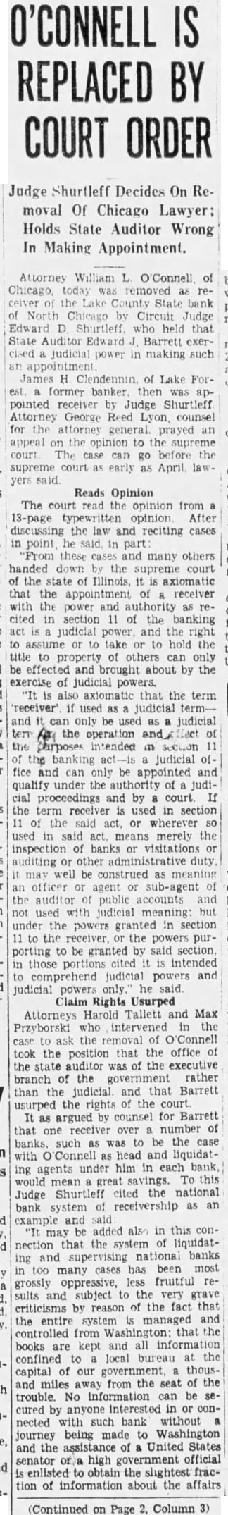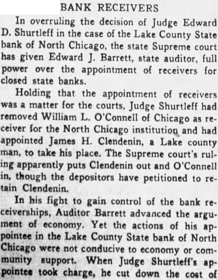 In overruling the decision of Judge Edward D. Shurtleff in the case of the Lake County State bank of North Chicago, the state Supreme court has given Edward Barrett, state auditor, full power over the appointment of receivers for closed banks. Holding that the appointment of receivers matter for the courts, Judge Shurtleff had removed William O'Connell of Chicago ceiver for the North Chicago institution and had James H. Clendenin, Lake county man, to take his place. The Supreme court's rulapparently puts Clendenin Connell in, though depositors have petitioned to tain Clendenin. In his fight to gain control of the bank receiverships, Auditor Barrett advanced the argument of economy. Yet the actions of his pointee in the Lake County State bank of North Chicago were not conducive to economy or community support. When Judge Shurtleff's pointee took charge, he cut down the cost