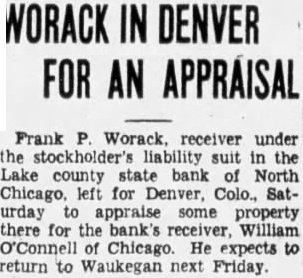 Frank Worack. receiver under the stockholder's liability suit in the Lake county state bank of North Chicago. left for Denver, Colo., Saturday to appraise some property there for the bank's receiver, William O'Connell of Chicago. He expects to return to Waukegan next Friday.