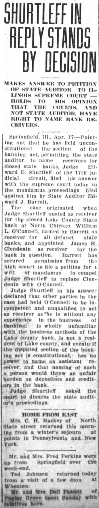Springfield, III., Apr. 17-Pointing out that he has held unconstitutional the section of the banking act, permitting the state auditor to name receivers for closed state banks, Judge Edward D. Shurtleff, of the 17th judicial circuit, filed his answer with the supreme court today in the mandamus proceedings filed against him by State Auditor Edward J. Barrett. The case originated when Judge Shurtleff ousted as receiver for the closed Lake County State bank at North Chicago. William L. O'Connell, named by Barrett as receiver for all defunct state banks, and appointed James H. Clendenin as receiver for the bank in question. Barrett has secured permission from the high scourt to file petition for writ of mandamus to compel Judge Shurtleff to replace Clendenin with O'Connell. Judge Shurtleff in his answer declared that other parties in the case had held Connell to be Incompetent and unqualified to act as receiver as "he is without any experience in the business of banking. is wholly unfamiliar with the business methods of the Lake county bank, is not a resident of Lake county, and evenin if the disputed section of the banking act is constitutional, has no power to name an assistant receiver, and that naming of such a person would throw an unfair burden on depositors and creditors in the bank. Judge Shurtleff asked the court to dismiss the state audit-
