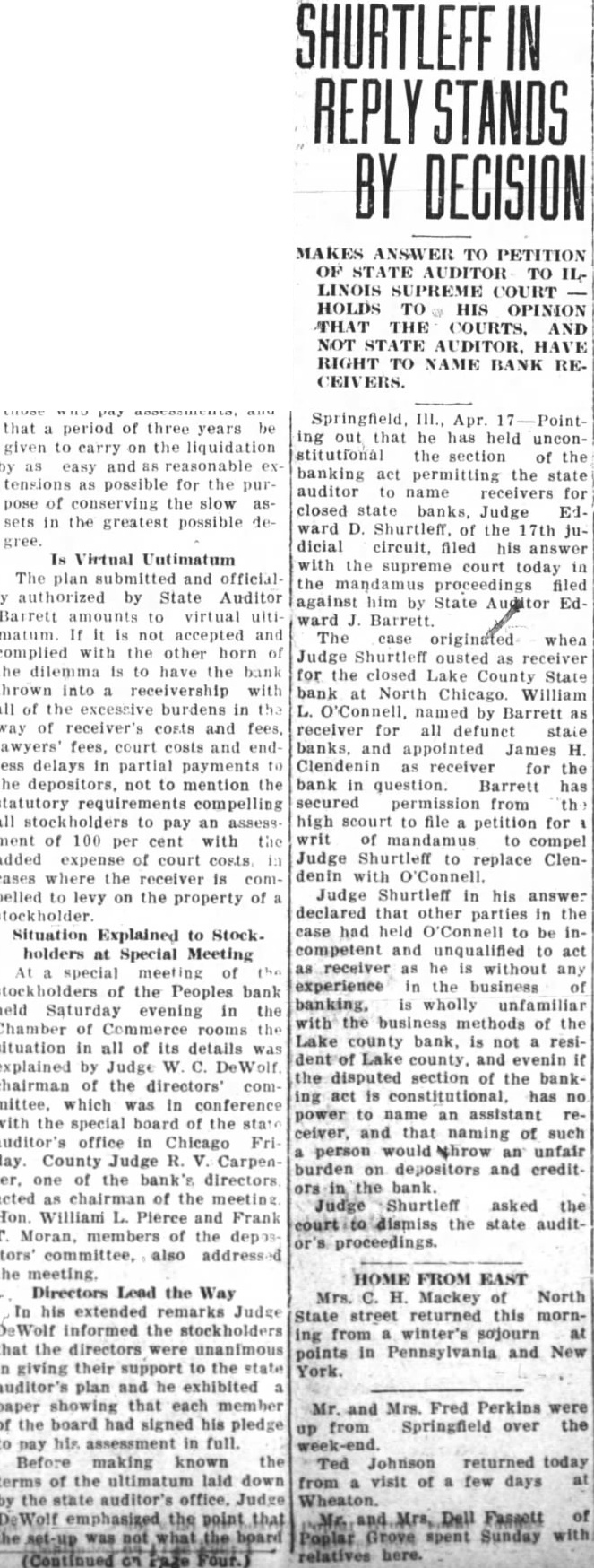 Attorney William of today removed the Lake County State bank North Chicago by Circuit Judge Edward Shurtleff who held Auditor Edward Barrett judicial power making such James of Lake pointed receiver Judge Shurtleff Attorney George Reed Lyon, for attorney prayed appeal opinion the case can go before the supreme court early April