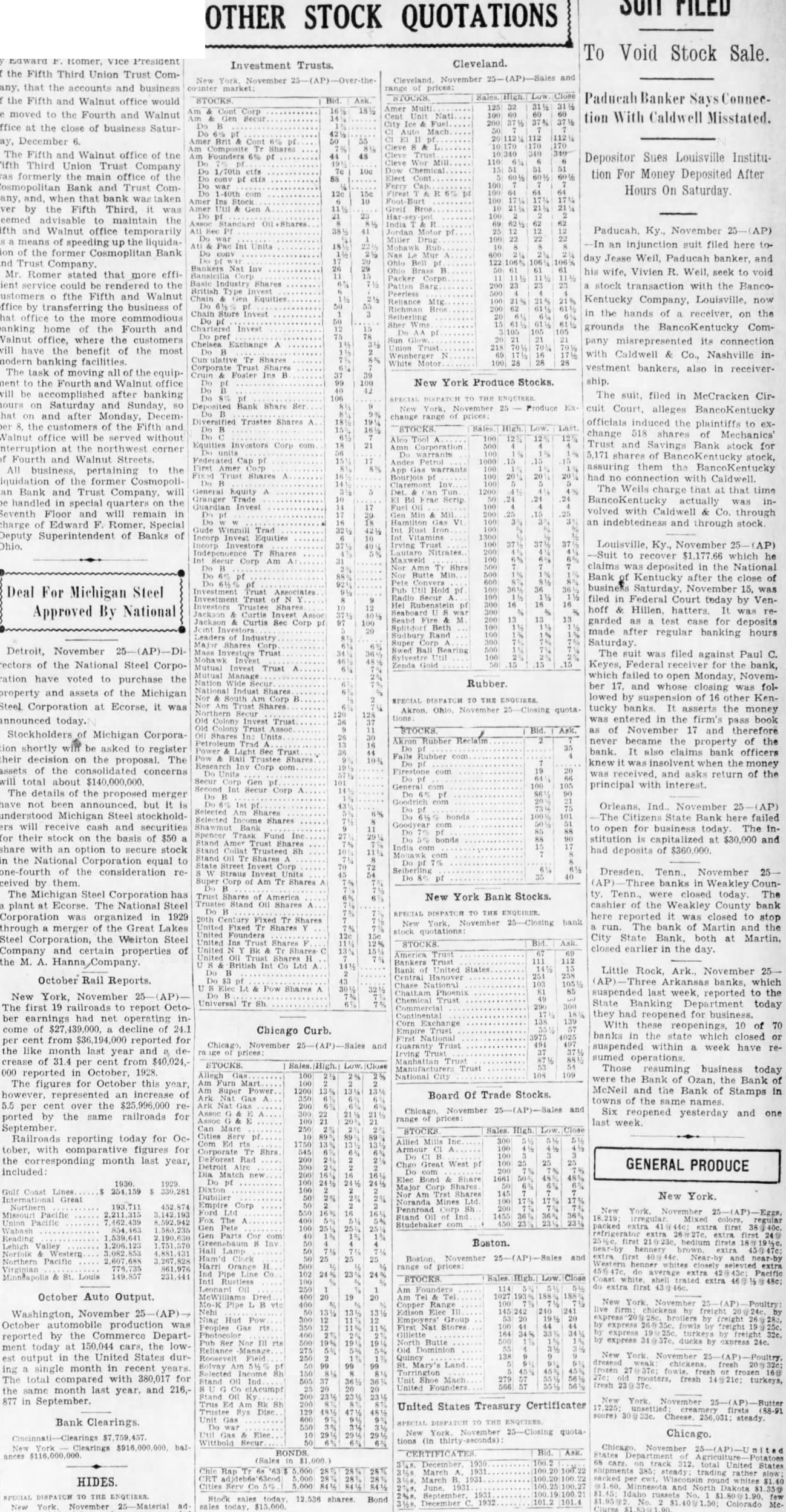 OTHER STOCK QUOTATIONS October Auto Output. Washington, November 25 (AP) October production reported by the Commerce Depart ment today at 150,044 cars, the low output in the United States dursingle month in recent years The total compared with 380,017 for the month last and 877 in September Rubber Bank Clearings. -Clearings Investment Trusts. Cleveland. New Cleveland Paducah Banker Says Connection With Caldwell Misstated. Cont 6% Depositor Sues Louisville Institu tion For Money Deposited After com Hours On Saturday 1-40th Paducah. Ky., November 25-(AP) Units an injunction suit filed here today Jesse Weil, Paducah banker, and Bankers his wife, Vivien R. Well seek to void stock transaction with the BancoEquities Kentucky Company Louisville. now in the hands of receiver, on the grounds the BancoKentucky Company misrepresented its connection Exchange Caldwell & Co., Nashville investment bankers, also in receiverNew York Produce Stocks. The suit, filed in McCracken CirBank cuit Court alleges BancoKentucky Trustee officials induced the plaintiffs to exchange 518 shares of Mechanics Corp Trust and vings Bank stock for 5,171 shares of stock, assuring them the Gas had no with Caldwell The Weils charge that at that time General Equity BancoK was inInvest volved with & Co. through Do an indebtedness and through stock Trad Louisville, Ky., November Shares -Suit to recover $1 177 which claims was deposited in the National Bank Kentucky after the close of Saturday November 15, was Deal For Michigan Steel Trust filed in Federal Court today by VenTrustee Rubenstein hoff & Hillen hatters It was reApproved By National garded test case for deposits made after regular banking hours Industry Saturday Detroit, November The suit was filed against Paul C. rectors of the National Steel Corpo- Keyes, Federal receiver for the bank, Invest which failed open Monday, Novemration have voted to purchase the ber 17. and whose closing was folproperty and assets of the Michigan Shares lowed by suspension 16 other KenSPECIAL THE Steel Corporation at it was tucky banks It asserts the money November Closing announced today. was entered in the firm's pass book Trust of November 17 and therefore Michigan Corpora never became the property of the tion shortly be asked to register Sec bank. It also claims bank officers their decision on the The knew was when the money Corp of the was and asks return of the will total about $140,000,000 Gen principal with interest. The details of the proposed merger have not but it Steel stockhold The Bank failed Shares ers will receive cash and securities to open for business today The infor their stock on the basis of $50 is capitalized at $30,000 and an option to stock Trusteed had deposits of $360,000. in the Corporation equal to Invest of the consideration received by them. Am banks in Weakley CounThe Michigan Steel Corporation has Trust ty, Tenn., closed today The Shares New York Bank Stocks. plant The National Steel Stand Shares cashier of the Weakley County bank Corporation was organized in 1929 here reported it was closed to stop Fixed Tr New through merger of the Great Lakes Fixed run. The bank of Martin and the Steel Corporation the Weirton Steel City State Bank, both at Martin. Company certain properties of closed earlier in the day. America the M. A. Int Little Rock, Ark. November 25October Rail Reports Three Arkansas banks, which National Shares suspended last week reported to the New York, November Trust State Banking Department today The first 19 railroads to report they had reopened for business. ber earnings had net operating With these reopenings, 10 of 70 come of decline of 24.1 Chicago Curb. National banks the state which closed or cent from $36 194,000 reported for suspended within a week have rethe like month last year and sumed operations. crease of per cent from resuming business today 000 reported in October. 1928. the Bank of Ozan. the Bank of The figures for October this year, Furn McNeil and the Bank of Stamps in an increase of Board Of Trade Stocks. Gas towns of the same names. 5.5 per cent over the and Six reopened yesterday and one ported by the same railroads for last week September Railroads reporting today for OcAllied tober, comparative figures for the month last West GENERAL PRODUCE New York first Boston. Lehigh Western extra Butte Mary's Mach fresh Ky November United States Treasury Certificates THE HIDES Bond sales