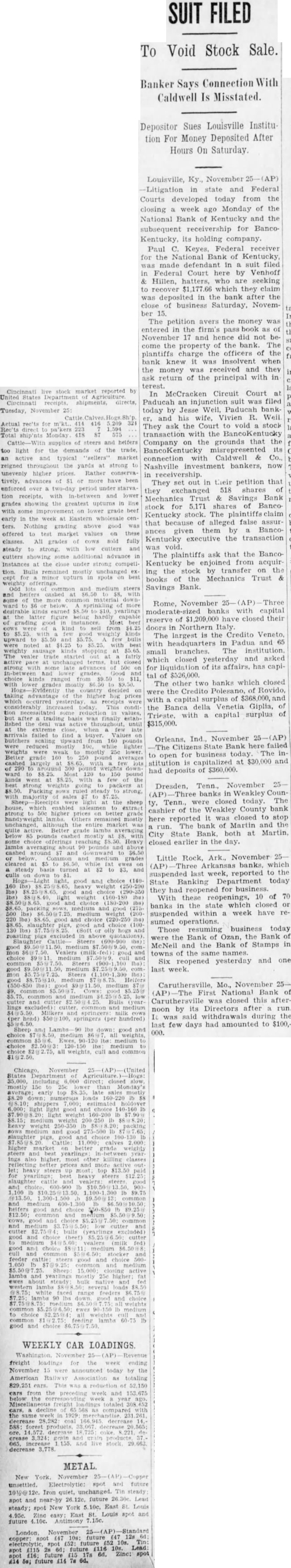 Cincinnati live market reported by November Actual rec'ts for 416 Monday 418 87 steers and helfers too light for the demands the trade, and market reigned strong higher in tively. $1 or have been enforced tion with and lower grades the greatest line some grade beef early in week at Eastern cenNothing grading above good was offered on these sold fully steady to with some the close competition. Bulls upturn spots and medium steers figure being grading good late 50c with hog tion basis 160 packers sales which $8.50 and $2 good choice weight 180 500 lbs) pigs Steers $8. medium Bulls common and milk (per (per Lambs- and choice medium to all and SUIT FILED To Void Stock Sale. Banker Says Connection With Caldwell Is Misstated. Depositor Sues Louisville Institu tion For Money Deposited After Hours On Saturday. Louisville, Ky., November 25-(AP) Litigation in and Federal Courts today from the closing week ago Monday of the National Bank Kentucky and the subsequent receivership for BancoKentucky, its holding company Paul C. receiver for the National of Kentucky, made in suit filed in Federal Court here by Venhoff & Hillen, hatters, who seeking to recover which they claim was in the bank after the close business Saturday, November 15. The petition avers the money was entered in the firm's pass book as November 17 and hence did not become the property of the bank. The plantiffs charge the officers of the bank knew was insolvent when the money was received and they ask return of the principal with in In McCracken Circuit Court at Paducah an injunction suit was filed today by Jesse Weil, Paducah banker, and his wife, Vivien R. Weil They ask the Court void stock transaction the BancoKentucky Company the grounds the BancoKentucky misrepresented its connection with Caldwell & Co. Nashville bankers, now They set out in their petition that they 518 shares of Trust Bank stock for 5,171 of BancoThe claim that because of alleged false assurances them by BancoKentucky executive the transaction was The plaintiffs ask that the BancoKentucky be enjoined from acquir ing the stock transfer on the books of the Mechanics Trust & Savings Bank. Rome, November banks capital reserve of $1,209,000 closed their doors Northern Italy. The largest the Credito Veneto with headquarters in Padua and 65 small branches. The which closed yesterday and asked for liquidation its affairs. capiof The two banks which closed were the Rovido, with of 000, and the Banca Venetia Giplia, of Trieste. with capital surplus of $315,000. Ind. November 25-(AP) The Bank here failed to open for business today inis capitalized at $30,000 and had of $360,000. Dresden, Tenn., November Three banks Weakley County. Tenn. closed today. The cashier of the Weakley County bank here reported it was closed to stop bank of Martin and the City State Bank at Martin. closed the day. Little Rock, Ark., November 25banks, which last reported to the State Banking Department today they for business With reopenings, 10 of 70 banks the state which closed or suspended within week have resumed operations. Those resuming business today the Bank Ozan, the Bank of McNeil and the Bank of Stamps in towns of the Six reopened yesterday and one last week. Caruthersville, Mo., November 25First National Bank of Caruthersville closed this afternoon by its Directors after run It said withdrawals the last few days had amounted to $100,000. Chicago including good and and good good and and lambs and WEEKLY CAR LOADINGS 25freight the November were today by the American Railway Association totaling This of from the preceding and decline decrease and live decrease METAL New November unsettled. Electrolytic: future Iron unchanged. spot Lead steady; New York 10c. East Louis spot and 4.95c. East 4.10c. future Lead future future