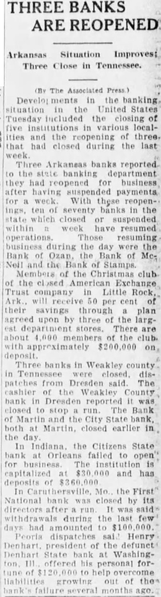 THREE BANKS ARE REOPENED Arkansas Situation Improves: Three Close in Tennessee. (By The Associated Press.) Develop ments in the banking, situation in the United States Tuesday included the closing of five institutions in various localities and the reopening of three. that had closed during the last Three Arkansas banks reported to the banking department they had reopened for business after having suspended payments for week With these reopenings, ten seventy banks in the state which closed or suspended within week have resumed Those resuming business during the day were the Bank of Ozan. the Bank of McNeil and the Bank of Stamps. Members of the Christmas club of the used American Exchange Trust company in Little Rock. Ark. will 50 per cent of their savings through plan agreed upon by three the largest stores. There are about 1.000 of the club. with appreximately $200,000 on, deposit. Three banks in Weakley county in Tennessee were closed dispatches from Dresden said The cashier of the Weakley County bank in Dresden reported it was closed to stop run. The Bank of Martin and the City State bank, both at Martin, closed earlier in the day In Indiana. the Citizens State bank at Orleans failed to open for business The institution is capitalized at $30 and has of In Mo. the First National bank was closed by its directors after run It was said withdrawals during the last few days had amounted to 000 Peoria dispatches sai Henry Denhart president of the defunct Denhart State bank at WashingIll offered his personal forof $120 000 to help overcome liabilities growing out of the several months