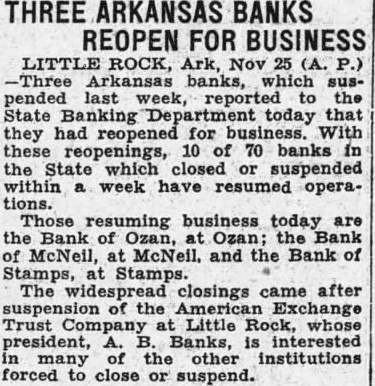 Those resuming business during the day were the Bank of Ozan. the Bank of McNeil and the Bank of Stamps. With these reopenings, ten ... banks in the state which closed or suspended within a week have resumed operations. Three Arkansas banks reported to the banking department they had reopened for business after having suspended payments for a week. With these reopenings, ten of the banks in the state which closed or suspended within a week have resumed operations. Those resuming business during the day were the Bank of Ozan, the Bank of McNeil and the Bank of Stamps.