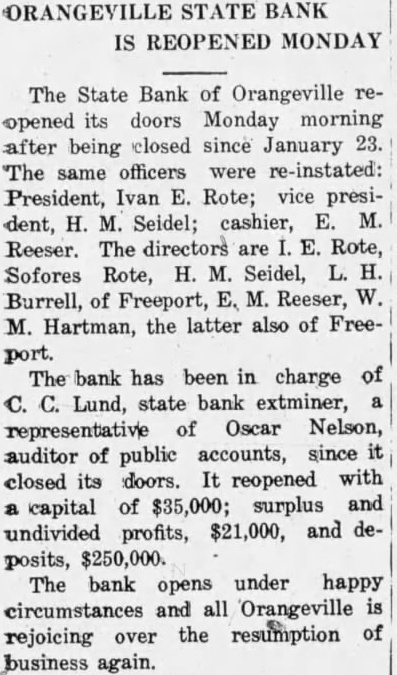 ORANGEVILLE BANK CLOSED Steady withdrawal of deposits and a depression of bond values was given as the cause of the failure of the State Bank of Orangeville to open its doors Saturday morning. Business at the Orangeville bank was suspended following an order issued by the board of directors who have requested that an examination and adjustment of the affairs of the institution be made by the state auditor. The following notice was posted on the door of the bank: "This bank is closed for examination and adjustment by order of the board of directors of the State Bank of Orangeville. E. M. Reeser, cash- Depression of bond values due to the business slump and the steady withdrawal of deposits during the past six months compelled the bank to take this action, according to a statement issued this morning by one of the officials. The bank was capitalized for $35,000, the last financial report indicating that there was surplus and profits amounting to $22,000. According to the last report the deposits amounted to $295,782. The State Bank of Orangeville is a merger of the People's State bank and the Orangeville State bank, the two having consolidated on July 1, 1925, under the present name. This is the only bank in Orangeville.