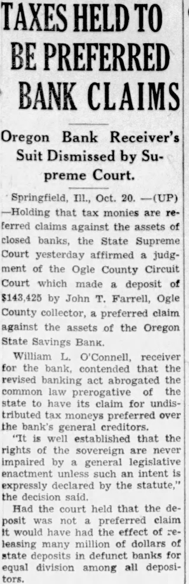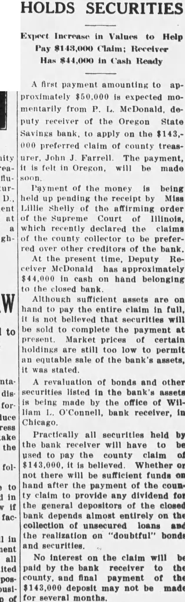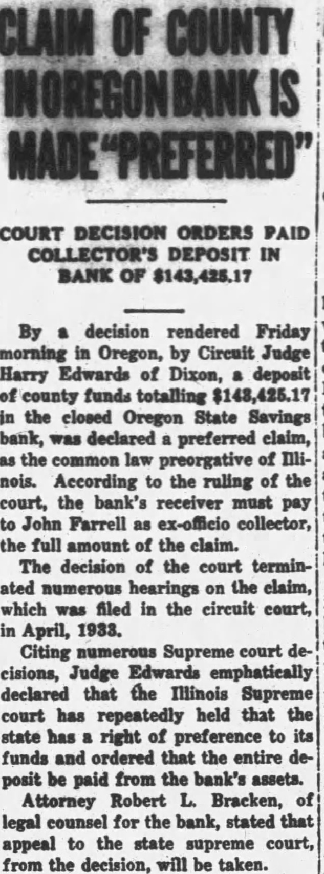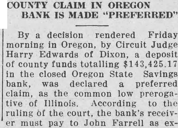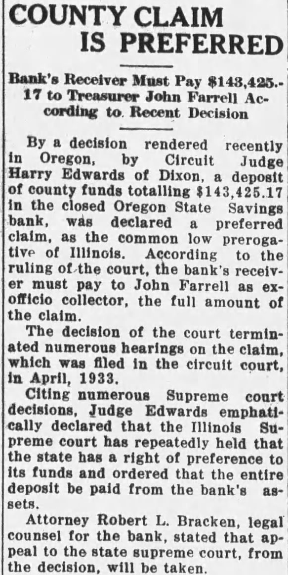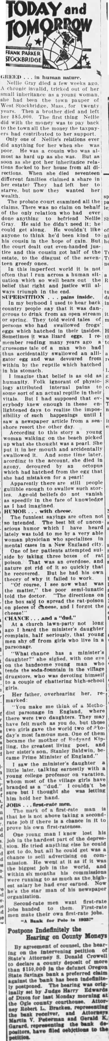 STOCKBRIDGE GREED in human nature. Nellie Gray died weeks chronic invalid, tricked out of her small inheritance young woman. she had been the town pauper of West Mass. years. Then died and left her The first thing Nellie did with the money was pay back the the had her support Only one Nellie's relations ever did for her when she was poor He cousin most hard up as she was. But soon got her relations flocked to her house from all rections When she died seventeen different families claimed share in her They her starve. but now they wanted her wealth The probate examined all the claims. There was claim on behalf of the only relation who had ever done anything to befriend Nellie Gray He said he didn't need could get along. He wouldn't like of anyone think he'd been kind his cousin the hope gain. But the court dealt out justice and this cousin got half of the estate, disgust of the seventeen greedy ones. In this imperfect world it is not often that run across human uation which well bears the belief that right and justice will triumph the end. SUPERSTITION pains inside. In my boyhood used hear back country people say that was dangerous drink from open stream spring. They told weird persons who had swallowed frogs eggs which hatched in their insides. Sometimes was lizard eggs. member reading many years ago gruesome of man who had thus accidentally swallowed alligator egg and devoured from within the reptile which hatched in his imagine that belief is as old humanity. Folk ignorant of physiology attributed internal pains some sort actual reptile in their vitals. But had supposed that erybody knew enough in these lightened to realize the impossibility such happenings until newspaper article from shore resort the other day According to this story young woman walking on the beach picked what she thought pearl She put in her mouth and accidentally swallowed And some time later acording the account. she died in devoured by octopus which had hatched from the egg that had mistaken for pearl! Apparently there still people gullible enough swallow such storAge-old beliefs do not vanish speedily in the face of imagined HUMOR cheese. The funniest sayings often not intended. The bit of unconscious humor which have heard lately told to me very able woman physician specializes in mental cases New England city. One her patients attempted suiside by taking three boxes of rat poison That was overdose. and nature got rid of quickly that he recovered But he had his own theory why failed to work course. now what was the matter,' the poor the doctor directions on told the box to spread the cheese, and forgot the on pieces and At church lawn-party long ago heard the minister's daughter complain. seriously. that young shy off from girls who live in parsonage. "What chance has minister's she sighed. with one eye on the young man who the village tends the himself who was couple of chattering girls. Her father. overhearing her, make me think of Methodist parsonage England, where there were two daughters. They may felt much you do, those have the world two of two girls gave most famous men. One of them became the mother Rudyard Kipliving poet, and the her sister's Stanley Baldwin. came Prime Minister of England. saw the minister's daughter little later. with young college professor on of the village girls have couldn't branded thought she was letting sure but him hold her hand. JOBS men. man is The mark of that he secondrate chance in to prove his One young man know lost his of the depresjob the hardest part else he could tried anything sion. but all he could get get to do, sell advertising on comchance He went the biggest job the world, and six months his within running to much as the high- Now he had ever earned. est salary man of his newspaper the star organization. want first-rate Second-rate men First-rate jobs handed make their own first-rate jobs. Bank for Polo 1933!" Postpone Indefinitely the Hearing on County Moneys By agreement of counsel, the hearpetition of on the intervening Donald Crowell State's Attorney deposit more declare county in the defunct Oregon than preferred claim Savings bank State been indefinitethe bank has against postponed. The hearing was Edwards origJudge Harry set inally of Dixon for last Monday morning courthouse. Attorthe Ogle county ney Robert Bracken, representing Attorneys receiver, and bank and Gerald Martin Peterman the bank derepresenting filed to the positors, have