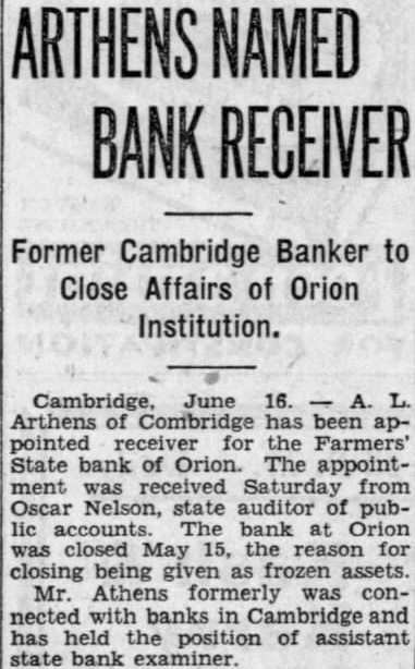 Former Cambridge Banker to Close Affairs of Orion Institution. Cambridge, June Arthens Combridge has been pointed receiver for the Farmers' State bank Orion. The appointment received Saturday from Oscar Nelson, state auditor of accounts. The bank Orion closed May 15, the reason closing being given frozen Mr. Athens formerly nected with banks in Cambridge and has held position of state bank examiner.