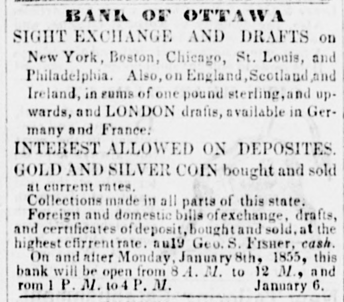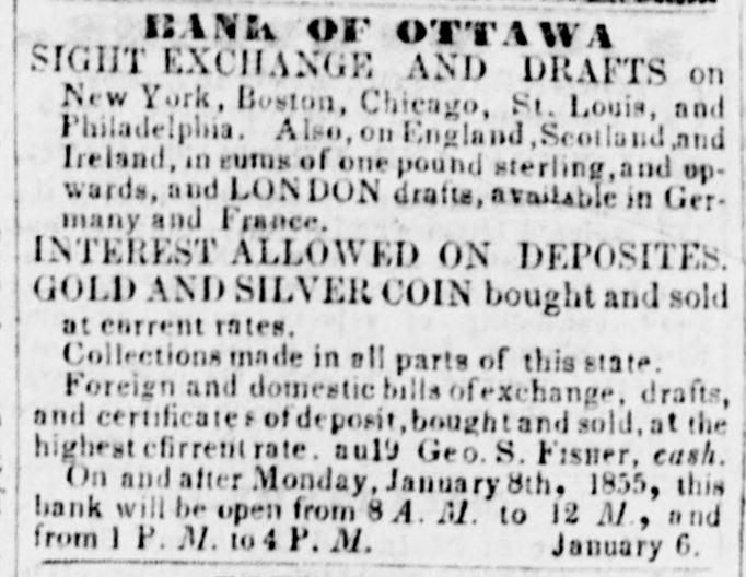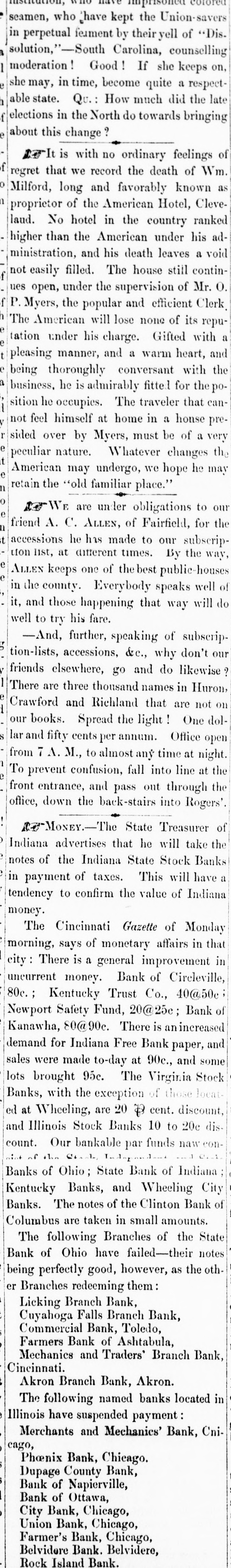 According to our last advices, the panic was to some extent abating. In Ohio, the Secretary of State advertises to take the notes of the suspended State Stock Banks on Taxes and all other public dues, as the State has ample security in Stocks deposited. The following banks have suspended payments since we published a list: City Bank of Chicago; Merchants & Mechanics Bank, Chicago; Farmers Bank, Chicago; Phoenix Bank, Chicago; Union Bank, Chicago; And as a consequence, two wild cat concerns from Georgia, but owned in Chicago: The Milledgeville Bank, Georgia; The Cherokee Bank & Ins. Co., Georgia; And the following Banks, located in other parts of the State of Illinois: Belvidere Bank; Bank of Rockford; Bank of Naperville; Bank of Ottawa; Du Page County Bank; Rock Island Bank; Rock River Bank, Beloit, Wis. These are mostly sma 1 institutions, with small circulation, and no necessity exists for a very deep shave upon their paper. The Brokers and Bankers of St. Louis have published a card agreeing to receive the notes of all the Illinois banks which have not 5113pended, at their face, and expressing confidence in the soundness and ultimate safety of the Free Banks of that State.