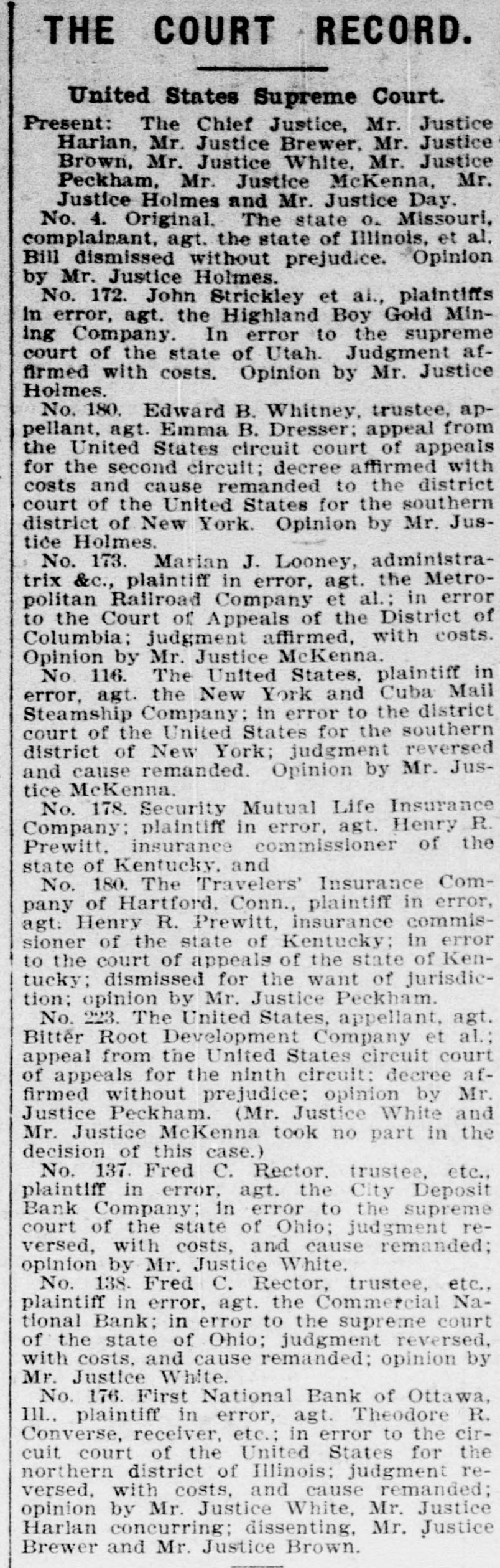 THE COURT RECORD Court of the United States. The Chief Justice, Justice Supreme Present Justice Brewer, Mr. Mr Just'ce Justice Harlan, Mr. Justice White, Mr. JusBrown, Mr. Mr. Justice McKenna, Mr. Peekham and Mr. Justice Day. was tice Albert Holmes Dean Carrier of Chicago III., admitted to practice. Pacific Railroad The Southern the United No. 142 et al., appellants, agt. Mr. J. H. Company argument continued by by Mr. States: the appellee and concluded Call for Evarts for the appellants error, Maxwell Rufus Martin plaintiff in by Mr. No. 170. state of Texas: submitted plaintiff in agt. the for the deerror and by Watson E. Coleman Mr. C. K. Bell for the Tendant in error John Strickley et al. Gold plaintiffs Minin No. error, 172. agt. the Argued Highland by Boy Mr. George Ing Company the defendant in error, for and the submitted Sutherland by for Mr. Arthur Brown in error. plaintiffs 17G. First National Bank Theodore of Ottawa, R. Ill., etc. No. plaintiff in error, agt. Argument commenced Converse, by receiver, Mr. Lester H. Strawn for the plaintiff Proceedings in error. after The Star went to press et yesterday Southern Pacific Company commerce al. No. appellants. 158. agt. the interstate Railway Company commission et commission; No. 159. appellant, Soutnern agt. California al. the interstate Fe commerce Atchison, Topeka and Santa the interNo. 160. Company. appellant et agt. al. Railway commerce commission Railroad Comappellant. state No. 161. Santa Fe agt. Pacific the interstate company, merce commission Southern et Pacific al.: and Company com- appellant. No 162. agt. the interstate concluded commerce by Mr. Robert mission; Dunlop argument for the Southern appellants. Pacific Railroad United No 141. et The al. appellants, agt. the Mr. MaxCompany argument commenced by continued States; Evarts, for the appellants, and conby well cluded Mr J. by H Mr. Call. Maxwell for the Evarts, appellee. for the appellents The Southern Pacific the Railroad United Company No. 142 et al. appellants. commenced agt. by Mr. MaxconStates: well Evarts argument for the appellants. for the appellee. and Nos. follows: tinued The day by Mr. call J for H Call, Thursday 142, 170, 172, January 176, 180, 23. is 182. as 183, 185, 186 and 187 District Supreme Court. EQUITY COURT NO. sale 1-Justice ratified nisi; Anderson comFrey agt. solicitor. Frey J. H. Wilson plainant's agt. Longshaw proof taken: before Longsha Wilson. examiner, ordered and Ruttledge solicitors, W. E Ambrose complainant Douglass: defendant' solicitors, Douglass P J. Ryan & and Crandal Mackey confesso against Berry & Minor. defendant Tucker ago. ordered: Bartol: complainant's pro solicitors, EQUITY COURT NO. 2-Justice trustees Stafford auSchneider agt Dallaghan; share, comto pay over infant's defendant's thorized solicitor E. Forrest P Myers. solicitors. plainant's Crandal Mackey and T. ratified Rothert agt. Brice: sale finally complaincause referred to auditor deand solicitors. Douglass & Douglass; ant' solicitor, John R. Shields fendant's lunacy of Otto Nestler account F of A Fenning committee In re referred to auditor attorney, Johnson agt. McWilliams; pro confesso B. ordered: complainant's solcitor, John Larner. agt. Tupper: substitution of Geo. F Havell. trustee Burgess to release; complainant's solicitor, Anderson agt. Sands: on hearing complainant's solicitors, W. J. Lambert and Ross D. W Baker defendant solicitors, R. Perry and W. C. Clephane. CIRCUIT COURT NO. 1-Justice Barnard Leakin agt. Mensh; verdict for plaintiff for $330; plaintiff's attorney, George C For- Aukam; defendant's attorneys, Padgett & rest. Hellman agt Davis; plaintiff withdraws and case continued; plaintiff's attor attorneys, juror Hallam & Hallam; defendant's nevs. Young E. lagt H. Thomas. Browning; flat on sci fa; plaintiff's attorney J. A. Butler fa plainYoung agt. Slater flat on sci tiff' Galvin attorney agt Scanlon J.A. Butler on trial plaintiff's J. A. George H. Calvert and O'Shea attorneys defendant' attorneys, M. J. Colbert and Michael J. & Co agt. O'Keane Wallerstein; judgment Golden order of inquisition vacated plaintiff's at attorney, and W. A. Johnston; defendant S torney, Malcolm Hufty Clabaugh CIRCUIT 'COURT NO. -Chief Justice Janini agt. Smith verdict for plaintiff Plain for and judgment without costs. H.B. $300 attorneys, Berry and Minor and Colbert Rowland; tiff's defendants attorneys, Hamilton & Gibbs agt. Reaves et al verdict for plain W for $250. riaintiff's attorney, D. J J. O'Donoghue; tiff defendant's attorneys Branden burg. Darlington and Brandenburg & CRIMINAL COURT NO 1 Justice murder, Wright agt. Mary Graves: on trial United States Attorneys J. McD. Carrington and S. D. Truitt. CRIMINAL COURT NO. -Justice Gould plainfor Shackman agt Skeados; verdict for $103.80 Plaintiff's attorney, H Winship tift Wheatley defendant 's attorney F Edward Mitchell PROBATE COURT-Justice Stafford of Ellen M. Thompson; order to Estate stock attorney, Crandal Mackey admittransfer Estate of Richard Rothwell will probate and letters testamentary William ted to Lillie Rothwell and C. Wagner; granted to bond, $1,500; attorney, Delmas Stutler Estate of F D. Joudon; order for burial; attorney F S. Perry Estate of Catherine Flynn; letters F. Flynn; of adgranted to James ministration attorney M. F Mangum bond. $100; of John E. Hammond petition Reilly for Estate of will filed; attorney W B. 31, probate Estate of Hugh Tuohy; will dated May 1905. filed. of Henrietta Miller; petition for letters Estate of administration filed; attorney, filed Belva Estate A of Lockwood Catharine L Davis; will dated November of 18 John 1889, Moran will admitted to to Estate letters testamentary granted Catherine probate and Moran; bond, $100; attorney, filed. James Estate A of O'Shea. Elizabeth Wood: will dated July 18 Estate 1888, of Elizabeth Bailey; will dated DeEstate of cember 11, 1905. Samuel filed Smith; will dated January 18, 1900, filed. H. Elliott; will dated Janwith petition proEstate 10,