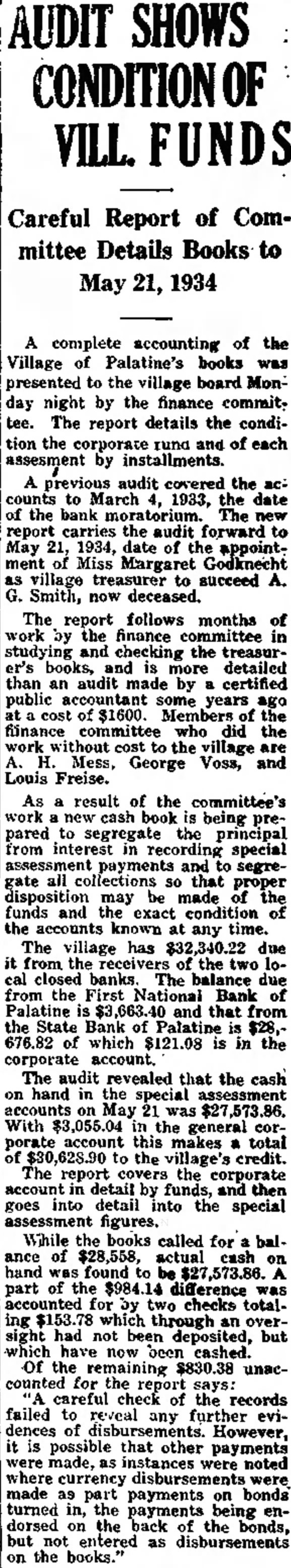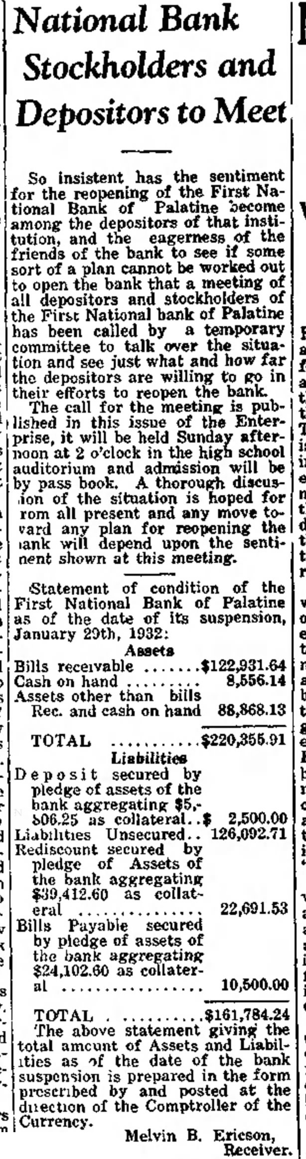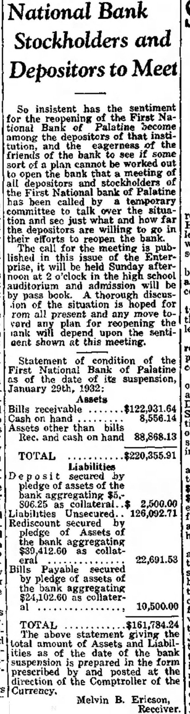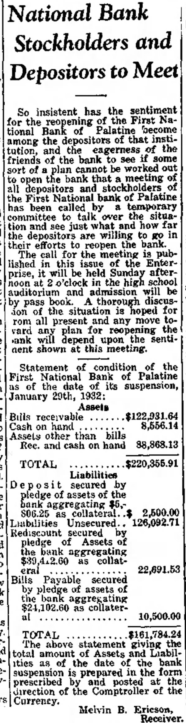 National Bank Stockholders and Depositors to Meet So insistent has the sentiment for the reopening the First National Bank Palatine become among the depositors of that insti- the tution, and eagerness friends of the bank to see some sort plan cannot be worked the bank that meeting open depositors First National bank of Palatine has been called temporary committee to talk over situaand just what and how far tion see the depositors are willing to go in their efforts reopen the bank. the meeting published in this issue the Enterit held Sunday afterprise, noon o'clock in the high school auditorium admission be pass book. thorough discusthe situation is hoped for all present any move vard plan for reopening ank upon sentinent shown at this meeting. Statement of condition of the First Bank of Palatine date of its suspension, January 29th, 1932: Bills receivable Cash hand 8,556.14 Assets other than bills Rec. and cash on hand 88,868.13 TOTAL $220,355.91 Liabilities secured pledge of assets 2,500.00 Liabilities Unsecured. 126,092.71 Rediscount pledge Assets the bank as collateral 22,691.53 Bills Payable secured by pledge of assets of the bank as collateral 10,500.00 TOTAL above statement giving the total amount of Assets Liabilities as of the date of the bank suspension prepared in the form preseribed posted at the direction of the Comptroller of the Currency. Melvin B. Receiver.