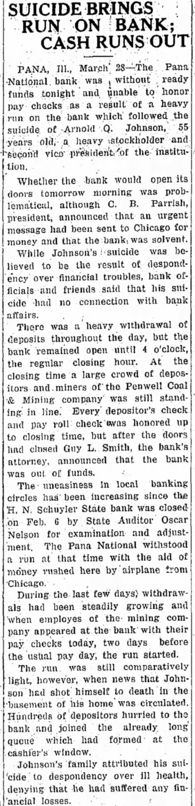 The Pana National bank did not open for business this morning. The suicide of A. J. Johnson, second vice president Friday noon, precipitated a Leavy run on the institution, which the bank was unable to withstand only until closing time. The decision to remain closed came a' a directors' meeting after the close of business at 4 'clock yesterday. National bank examiners were notified and a check of the bank's eondition will be started at once. The bank apparently is solvent, it is said.