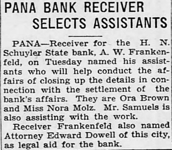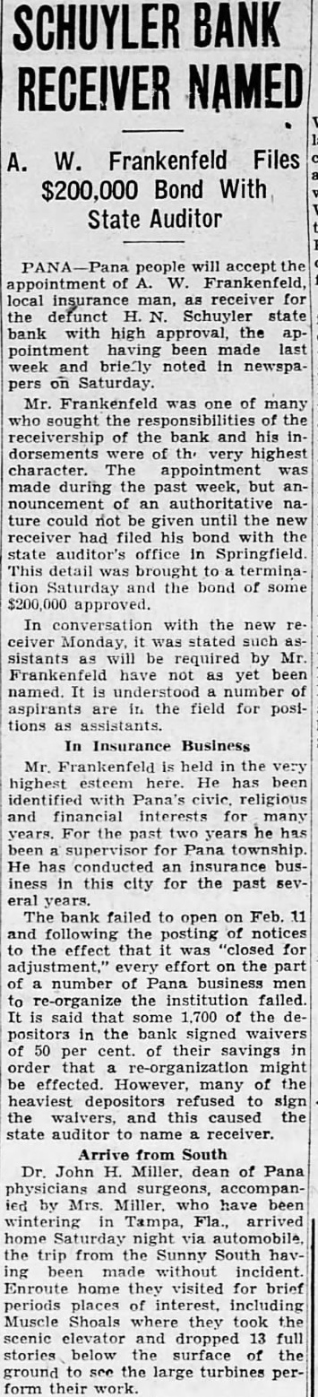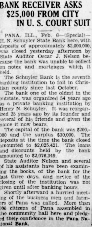 Pana Without a Bank Withdrawals at the time of the failure of the H. N. Schuyler State bank of that city on February 6, were greatly instrumental in the exhaustion of the bank's resources, At that time $250,000 was sent by airplane from Chicago to the National bank, but the money was returned later. Pana is now left without a bank. The Schuyler bank with assets of $2,000,000, was closed because of frozen assets. The institution is now in process of reorganization. Depositors have agreed to waiver one half of their deposits so that the bank may reopen.