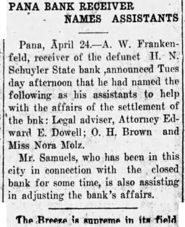 Plan New Bank It was understood from very reliable sources this morning that a definite plan has already been inaugurated in Pana for the organization of new bank there at the earliest possible convenience. A waiver of 50 por cent of the deposits of the Schuyler bank was recently voted and it hoped that plans can be made to merge the assets of the two organizations into a new bank.