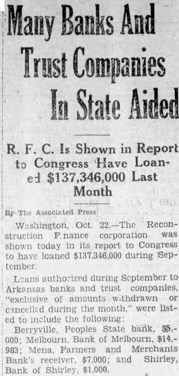 Banks Many Trust Companies State Shown in Report to Congress Have LoanLast Month Press Oct. Reconstruction nance corporation was shown today its report to Congress have loaned during September Loans authorized during September to Arkansas banks and trust companies, "exclusive during the month." were listto include following: Berryville, Peoples State bank. $5.Bank Mena, Farmers and Merchants Bank's receiver, and Shirley, Bank of