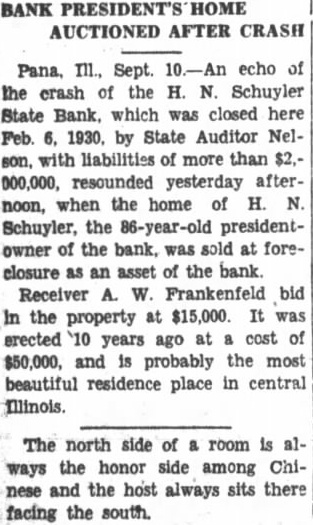 BANK PRESIDENT'S'HOME AUCTIONED AFTER CRASH Pana, III., Sept. 10.-An echo of the erash of the H. N. Schuyler State Bank. which was closed here Feb. 6, 1930. by State Auditor Nelson. with liabilities of more than $2.000,000, resounded yesterday afternoon, when the home of H. N. Schuyler, the 86-year-old presidentowner of the bank, was sold at foreclosure as an asset of the bank. Receiver A. W. Frankenfeld bid In the property at $15,000. It was erected '10 years ago at a cost of $50,000, and is probably the most beautiful residence place in central The north side of a room is always the honor side among Chinese and the host always sits there facing the south.