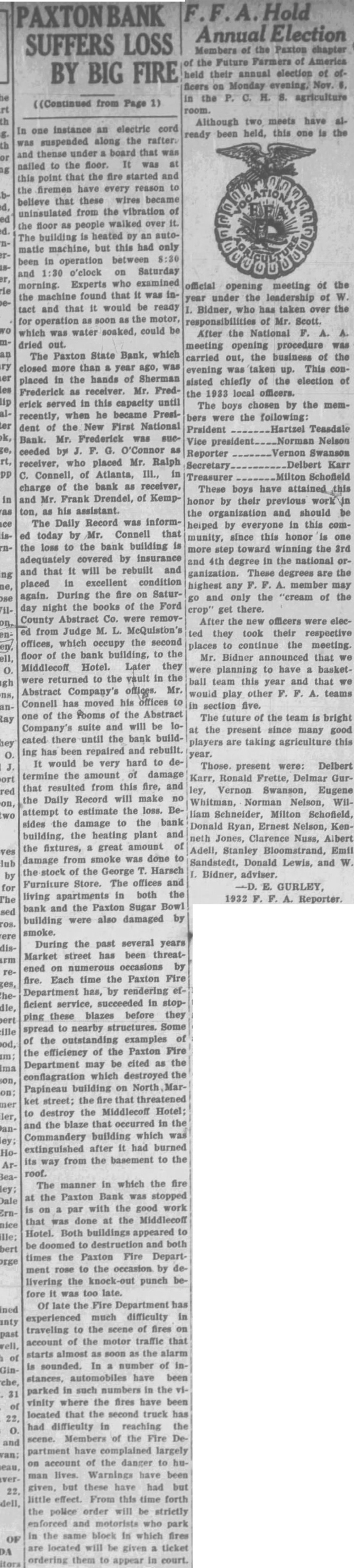 SUFFERS from instance an electric cord one suspended along the rafter. and thense under board that nailed the floor. was point that the fire started and the firemen have every that these wires became believe uninsulated from the vibration floor people walked over The building heated automachine, but this had only matic operation between been o'clock on Saturday and Experts examined morning. machine found that the and that would be ready tact soon the motor, for operation water soaked, could be which dried out. The Paxton State Bank, which closed more than year was in the hands of Sherman placed Frederick receiver. Mr. Fredserved in this capacity until when he became Presirecently, of the New First National dent Bank. Mr. Frederick was ceeded by who placed Mr. Ralph receiver, Connell, of Atlanta, III., charge of the bank as receiver, and Mr. Frank Drendel, Kempton, as his assistant. The Daily Record was informtoday by Connell that the loss to the bank building adequately covered by insurance that will be rebuilt and excellent condition placed During the fire on Saturagain. the books of the Ford day night Abstract Co. were removCounty from Judge McQuiston's offices, which occupy the second floor the bank building, the Middlecoff Hotel. Later they returned to the vault in the offices. Mr. Abstract Company's Connell moved his offices of the of the Abstract suite and will be Company's until the bank buildthere ing has been repaired and rebuilt. would be very hard to termine the amount damage resulted from this fire, and that the Daily Record will make to estimate the loss. attempt damage to the bank sides the the heating plant and great amount of the fixtures, from smoke was done damage of the George Harseh the Furniture Store. The offices and in both the living apartments bank and the Paxton Sugar Bowl building were also damaged smoke. During the past several years Market street has been threatened on by Each time the Paxton Fire fire. Department has, by rendering ficient service, succeeded in stopthese blazes before they ping to nearby structures. Some spread the outstanding examples the efficiency of the Paxton be cited the Department may which destroyed the conflagration Papineau building ket the that threatened street; the Middlecoff Hotel; destroy and the blaze that occurred in the Commandery building which after had burned extinguished from the basement to the way roof. The manner in which the fire the Paxton Bank was stopped par with the good work done the Middlecoff that Hotel. Both buildings appeared doomed destruction and both times the Paxton Fire Department rose to the by livering the punch fore was late. Of late Department experienced much difficulty traveling the scene of fires account the motor traffic that almost soon the alarm sounded. number of stances, automobiles have been parked such numbers in vinity where the fires have located that the second truck has had difficulty reaching the Members the Department have complained largely account of the danger man lives. Warnings have been given, but have had but effect. From this time forth the police order will be and motorists who the same block In which fires located will given ticket them to appear the Future Farmers America their annual election ficers Monday evening, Although been official meeting the opening under the leadership Bidner, who has taken over the of Scott. After the National meeting opening procedure carried out, the business of the evening was taken up. This consisted chiefly of the election local officers. The boys chosen by the members were the following: Prsident Teasdale Vice Nelson Reporter Swanson Secretary Delbert Karr Treasurer Schofield These boys have honor by their previous the organization and should helped by everyone in this community, since this honor one more step toward winning the 3rd and 4th degree in the national organization. These degrees are the highest any member may and only the "cream of the get there. After the new officers were electhey took their respective places continue the meeting. Mr. Bidner announced that were planning to have basketball team this year and that would play other teams section five. The future of the team bright the present since many good players are taking agriculture this year. Those. present were: Delbert Karr, Ronald Frette, Delmar GurVernon Swanson, Eugene Whitman, Norman Nelson, William Schneider, Milton Schofield, Donald Ryan, Ernest Nelson, Kenneth Jones, Clarence Nuss, Albert Adell, Stanley Bloomstrand, Emil Sandstedt, Donald Lewis, and Bidner, adviser. GURLEY, Reporter.