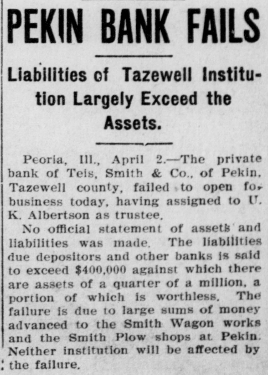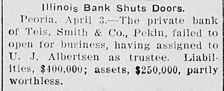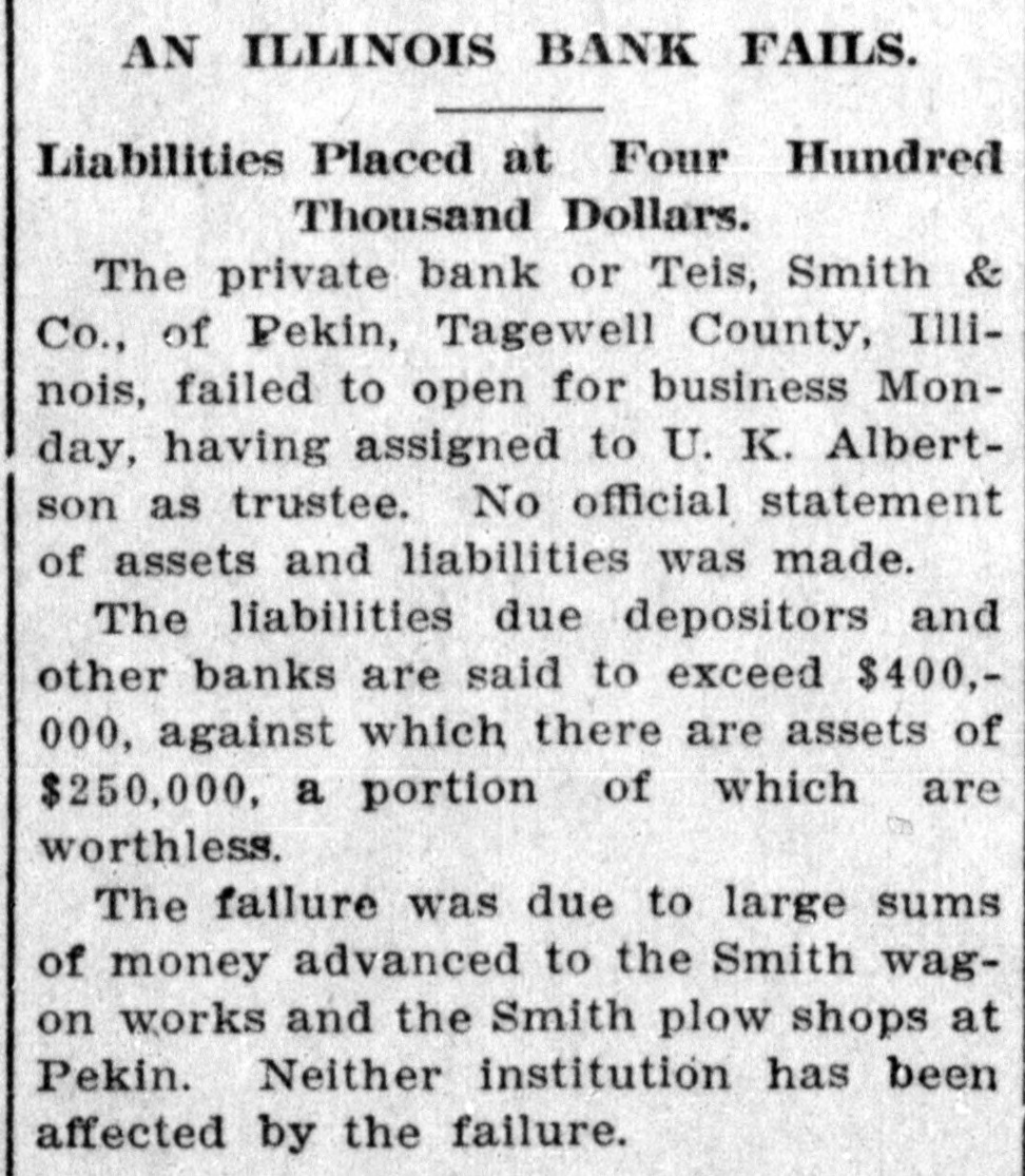 AN ILLINOIS BANK FAILS. Liabilities Placed at Four Hundred Thousand Dollars. The private bank or Teis, Smith & Co., of Pekin, Tagewell County, Illinois, failed to open for business Monday, having assigned to U. K. Albertson as trustee. No official statement of assets and liabilities was made. The liabilities due depositors and other banks are said to exceed $400,000, against which there are assets of $250,000, a portion of which are worthless. The failure was due to large sums of money advanced to the Smith wagon works and the Smith plow shops at Pekin. Neither institution has been affected by the failure.