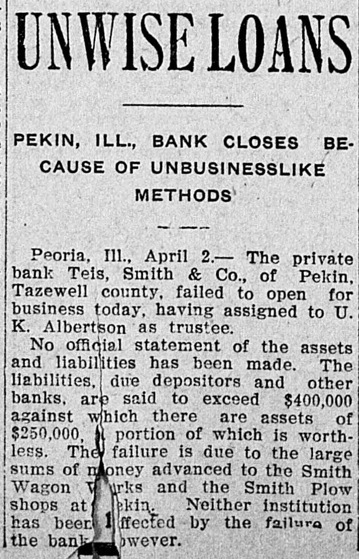 UNWISE LOANS PEKIN, ILL., BANK CLOSES BECAUSE OF UNBUSINESSLIKE METHODS Peoria, Ill., April 2.- The private bank Teis, Smith & Co., of Pekin, Tazewell county, failed to open for business today, having assigned to U. K. Albertson as trustee. No official statement of the assets and liabilities has been made. The liabilities, due depositors and other banks, are said to exceed $400,000 against which there are assets of $250,000, al portion of which is worthless. The failure is due to the large sums of money advanced to the Smith Wagon V urks and the Smith Plow shops at ekin. Neither institution has been 1 ffected by the failure of owever. the bank