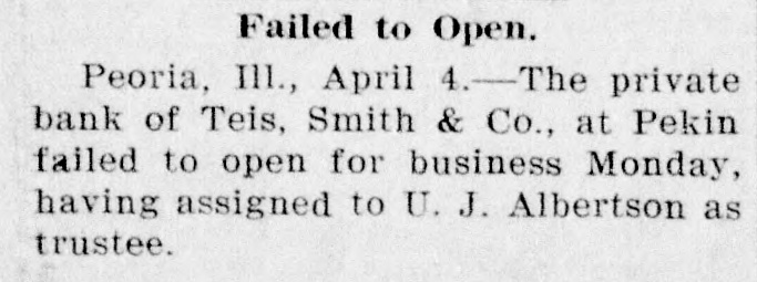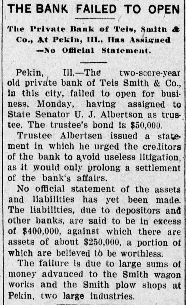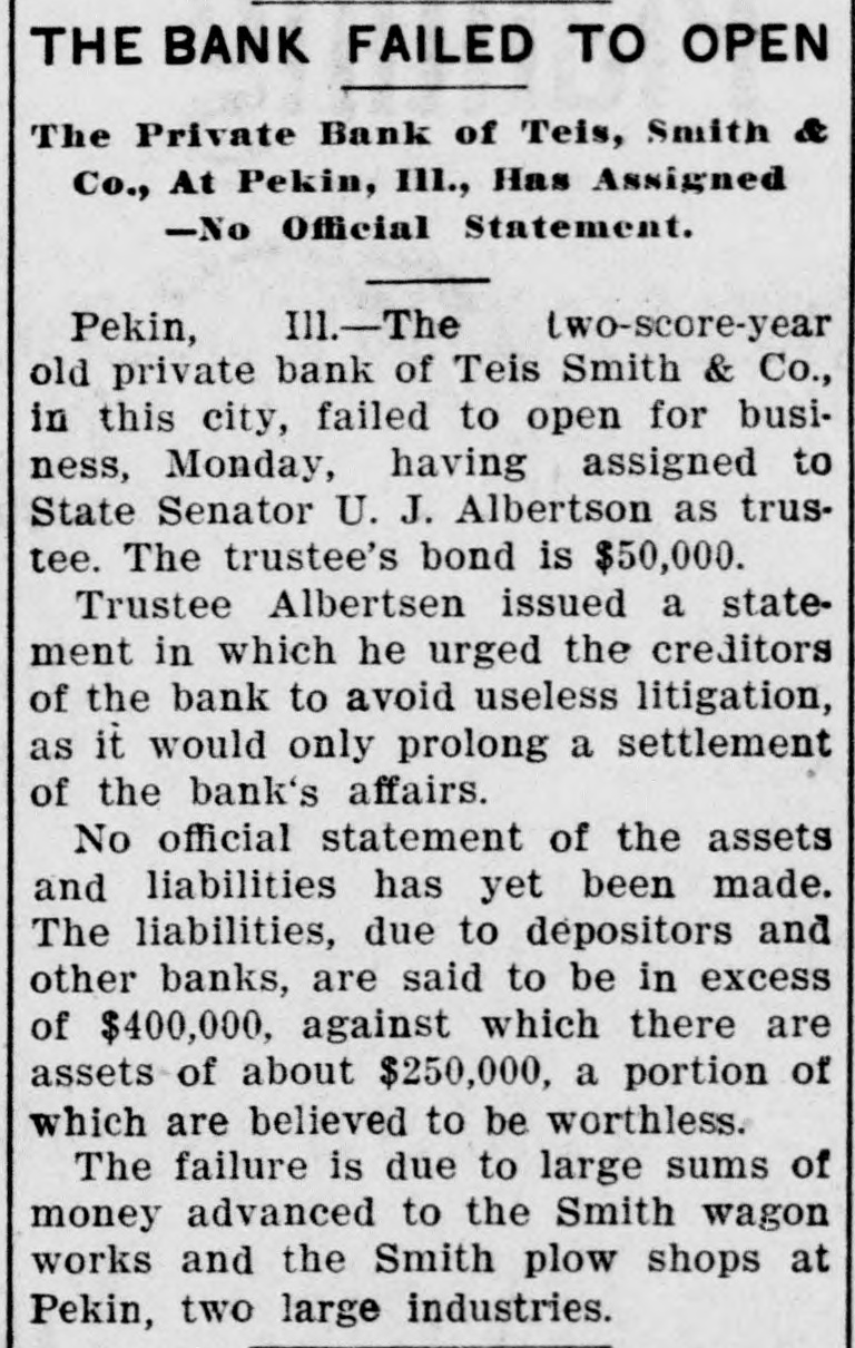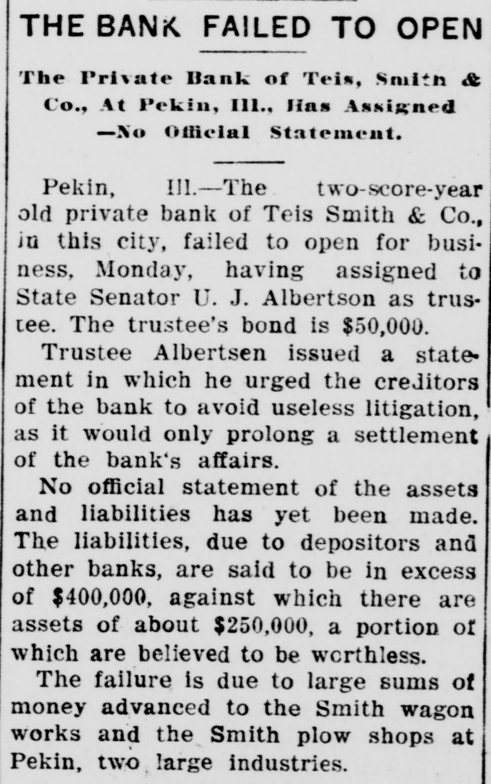 THE BANK FAILED TO OPEN The Private Bank of Teis, Smith & Co., At Pekin, III., Has Assigned -No Official Statement. Ill.-The two-score-year Pekin, old private bank of Teis Smith & Co., in this city, failed to open for business, Monday, having assigned to State Senator U. J. Albertson as trustee. The trustee's bond is $50,000. Trustee Albertsen issued a statement in which he urged the creditors of the bank to avoid useless litigation, as it would only prolong a settlement of the bank's affairs. No official statement of the assets and liabilities has yet been made. The liabilities, due to depositors and other banks, are said to be in excess of $400,000, against which there are assets of about $250,000, a portion of which are believed to be worthless. The failure is due to large sums of money advanced to the Smith wagon works and the Smith plow shops at Pekin, two large industries.