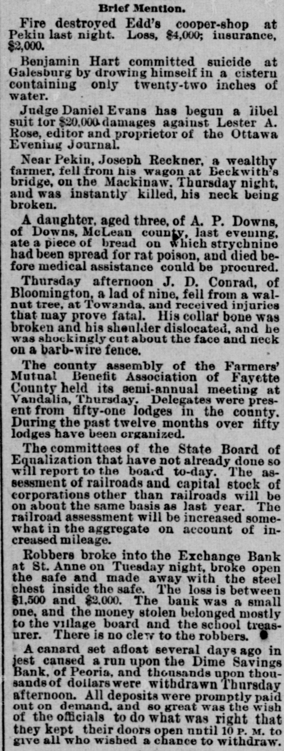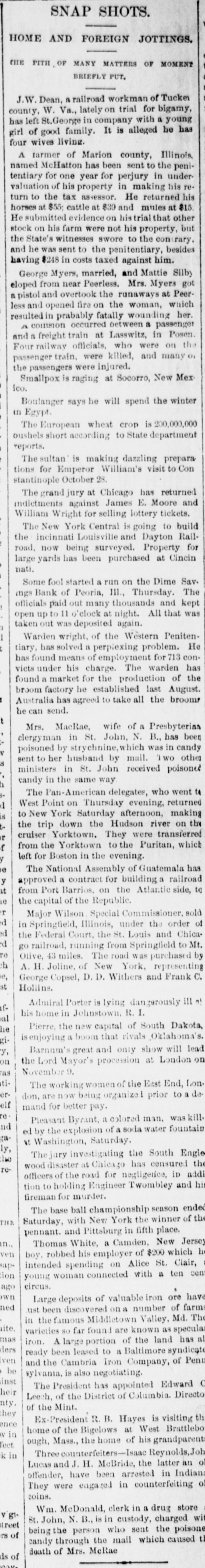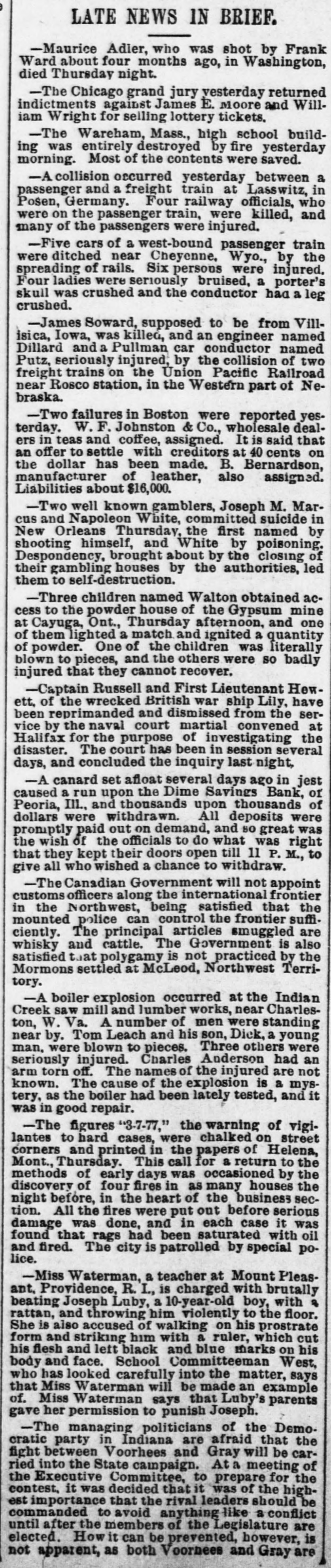 LATE NEWS IN BRIEF. -Maurice Adier, who was shot by Frank Ward about four months ago, in Washington, died Thursday night. -The Chicago grand jury vesterday returned indictments against James E. Moore and William Wright for selling lottery tickets. -The Wareham, Mass., high school building was entirely destroyed by fire yesterday morning. Most of the contents were saved. -A collision occurred yesterday between a passenger and a freight train at Lasswitz, in Posen, Germany. Four railway officials, who were on the passenger train, were killed, and many of the passengers were injured. -Five cars of a west-bound passenger train were ditched near Cheyenne, Wyo., by the spreading of rails. Six persons were injured. Four ladies were seriously bruised, a porter's skull was crushed and the conductor had a leg crushed. -James Soward, supposed to be from Villisica, Iowa, was killed, and an engineer named Dillard and a Pullman car conductor named Putz, seriously injured, by the collision of two freight trains on the Union Pacific Railroad near Rosco station, in the Western part of Nebraska. -Two failures in Boston were reported yesterday. W. F. Johnston & Co., wholesale dealers in teas and coffee, assigned. It is said that an offer to settle with creditors at 40 cents on the dollar has been made. B. Bernardson, manufacturer of leather, also assigned. Liabilities about $16,000. -Two well known gamblers, Joseph M. Marcus and Napoleon White, committed suicide in New Orleans Thursday, the first named by shooting himself, and White by poisoning. Despondency, brought about by the closing of their gambling houses by the authorities, led them to self-destruction. -Three children named Walton obtained access to the powder house of the Gypsum mine at Cayuga, Ont., Thursday afternoon, and one of them lighted a match and ignited a quantity of powder. One of the children was literally blown to pieces, and the others were so badly injured that they cannot recover. -Captain Russell and First Lieutenant Hewett, of the wrecked British war ship Lily, have been reprimanded and dismissed from the service by the naval court martial convened at Halifax for the purpose of investigating the disaster. The court has been in session several days, and concluded the inquiry last night, -A canard set afloat several days ago in jest caused a run upon the Dime Savings Bank, of Peoria, Ill., and thousands upon thousands of dollars were withdrawn. All deposits were promptly paid out on demand, and so great was the wish of the officials to do what was right that they kept their doors open till 11 P. M., to give all who wished a chance to withdraw. -The Canadian Government will not appoint customs officers along the international frontier in the Northwest, being satisfied that the mounted police can control the frontier sufficiently. The principal articles smuggled are whisky and cattle. The Government is also satisfied that polygamy is not practiced by the Mormons settled at McLeod, Northwest Territory. -A boiler explosion occurred at the Indian Creek saw mill and lumber works, near Charleston, W. Va. A number of men were standing near by. Tom Leach and his son, Dick, a young man, were blown to pieces. Three others were seriously injured. Charles Anderson had an arm torn off. The names of the injured are not known. The cause of the explosion is a mystery, as the boiler had been lately tested, and it was in good repair. -The figures "3-7-77," the warning of vigilantes to hard cases, were chalked on street corners and printed in the papers of Helena, Mont., Thursday. This call for a return to the methods of early days was occasioned by the discovery of four fires in as many houses the night before, in the heart of the business section. All the fires were put out before serious damage was done, and in each case it was found that rags had been saturated with oil and fired. The city is patrolled by special police. -Miss Waterman, a teacher at Mount Pleasant. Providence, R. I., is charged with brutally beating Joseph Luby, a 10-year-old boy, with a rattan, and throwing him violently to the floor. She is also accused of walking on his prostrate form and striking him with a ruler, which cut his flesh and left black and blue marks on his body and face. School Committeeman West, who has looked carefully into the matter, says that Miss Waterman will be made an example of. Miss Waterman says that Luby's parents gave her permission to punish Joseph. -The managing politicians of the Democratic party in Indiana are afraid that the fight between Voorhees and Gray will be carried into the State campaign. At a meeting of the Executive Committee, to prepare for the contest, it was decided that it was of the highest importance that the rival leaders should be commanded to avoid anything like a conflict until after the members of the Legislature are elected. How it can be prevented, however, is not apparent, as both Voornees and Gray are