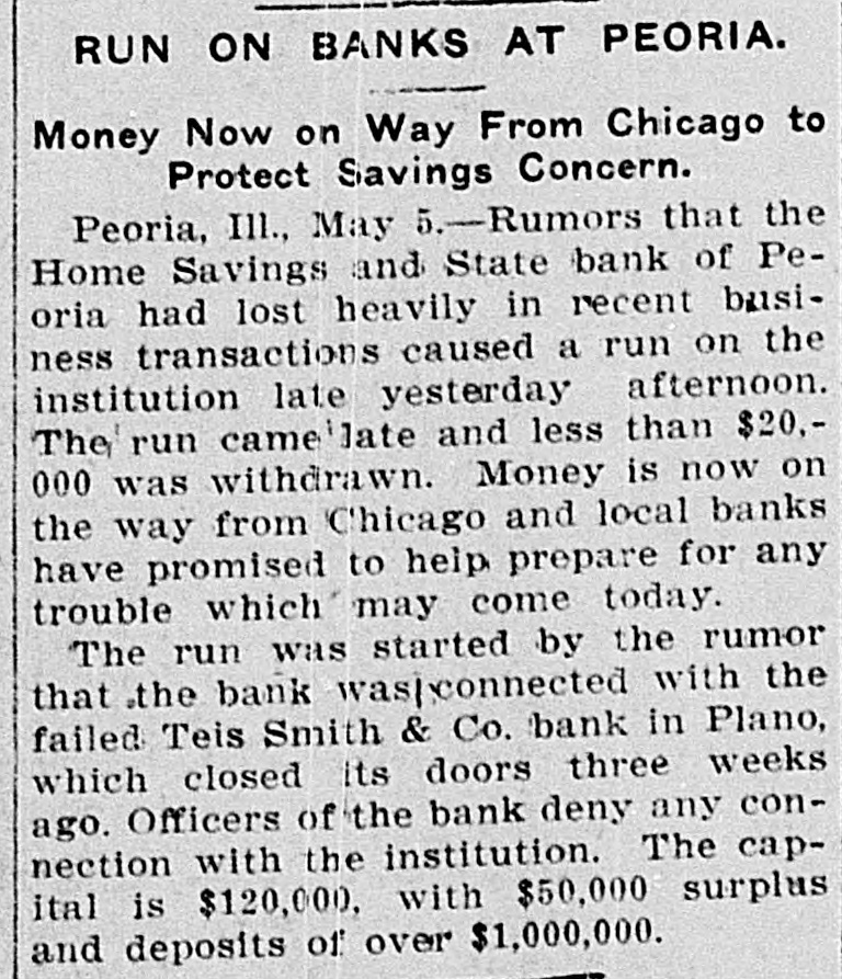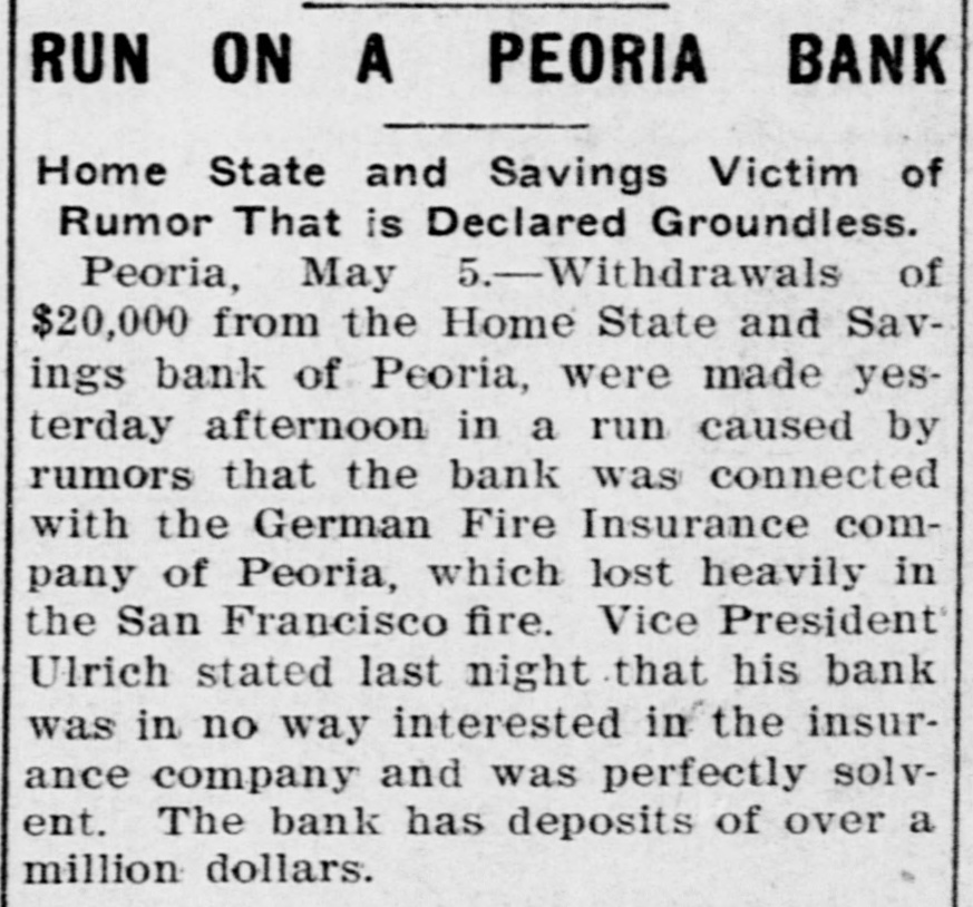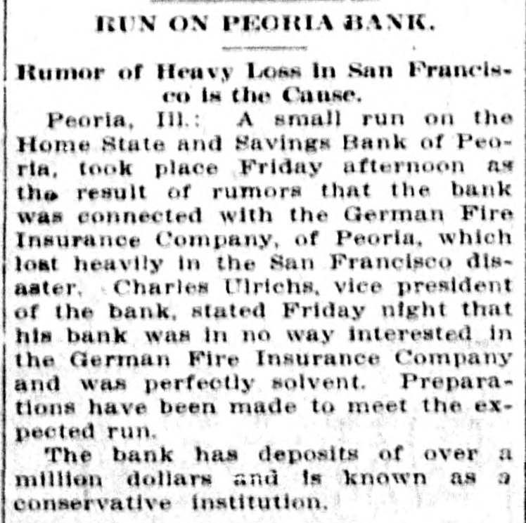 RUN ON A PEORIA BANK Home State and Savings Victim of Rumor That is Declared Groundless. Peoria, May 5.-Withdrawals of $20,000 from the Home State and Savings bank of Peoria, were made yesterday afternoon in a run caused by rumors that the bank was connected with the German Fire Insurance company of Peoria, which lost heavily in the San Francisco fire. Vice President Ulrich stated last night that his bank was in no way interested in the insurance company and was perfectly solvent. The bank has deposits of over a million- dollars.