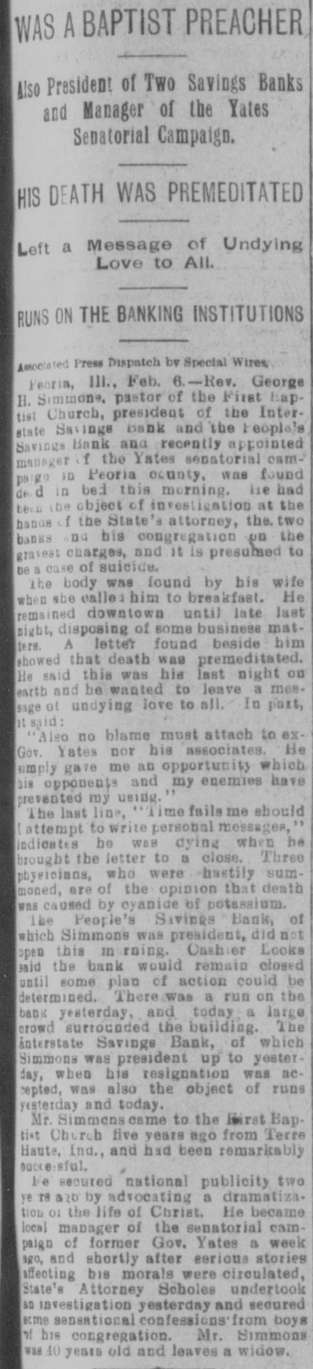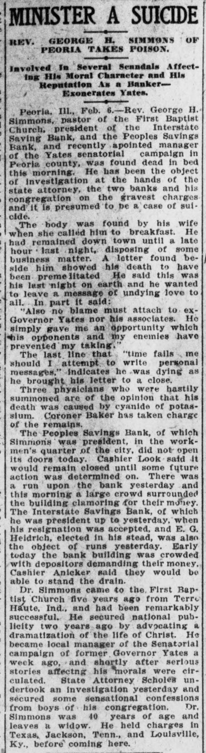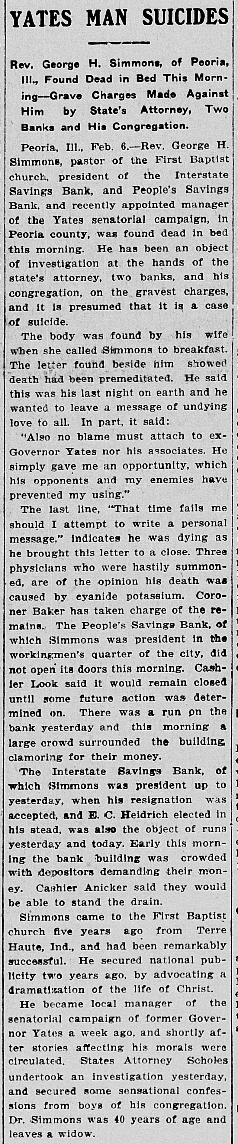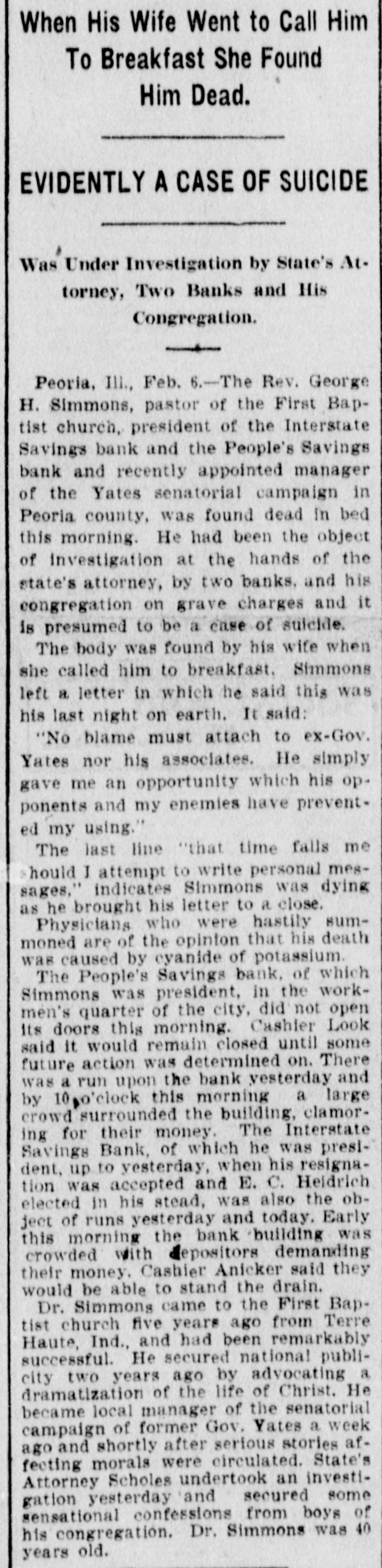 YATES MAN SUICIDES Rev. George H. Simmons, of Peoria, III., Found Dead in Bed This Morning--Grave Charges Made Against Him by State's Attorney, Two Banks and His Congregation. Peoria, Ill., Feb. 6.-Rev. George H. Simmons, pastor of the First Baptist church, president of the Interstate Savings Bank, and People's Savings Bank, and recently appointed manager of the Yates senatorial campaign, in Peoria county, was found dead in bed this morning. He has been an object of investigation at the hands of the state's attorney, two banks, and his congregation, on the gravest charges, and it is presumed that it is a case of suicide. The body was found by his wife when she called Simmons to breakfast. The letter found beside him showed death had been premeditated. He said this was his last night on earth and he wanted to leave a message of undying love to all. In part, it said: "Also no blame must attach to exGovernor Yates nor his associates. He simply gave me an opportunity, which his opponents and my enemies have prevented my using." The last line, "That time fails me should I attempt to write a personal message," indicates he was dying as he brought this letter to a close. Three physicians who were hastily summoned, are of the opinion his death was caused by cyanide potassium. Coroner Baker has taken charge of the remains. The People's Savings Bank, of which Simmons was president in the workingmen's quarter of the city, did not open its doors this morning. Cashier Look said it would remain closed until some future action was determined on. There was a run on the bank yesterday and this morning a large crowd surrounded the building clamoring for their money. The Interstate Savings Bank, of which Simmons was president up to yesterday, when his resignation was accepted, and E. C. Heidrich elected in his stead, was also the object of runs yesterday and today. Early this morning the bank building was crowded with depositors demanding their money. Cashier Anicker said they would be able to stand the drain. Simmons came to the First Baptist church five years ago from Terre Haute, Ind., and had been remarkably successful. He secured national publicity two years ago, by advocating a dramatization of the life of Christ. He became local manager of the senatorial campaign of former Governor Yates a week ago, and shortly after stories affecting his morals were circulated. States Attorney Scholes undertook an investigation yesterday, and secured some sensational confessions from boys of his congregation. Dr. Simmons was 40 years of age and leaves a widow.