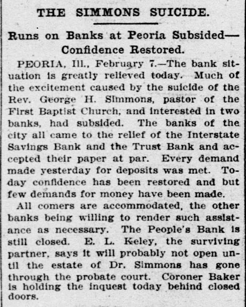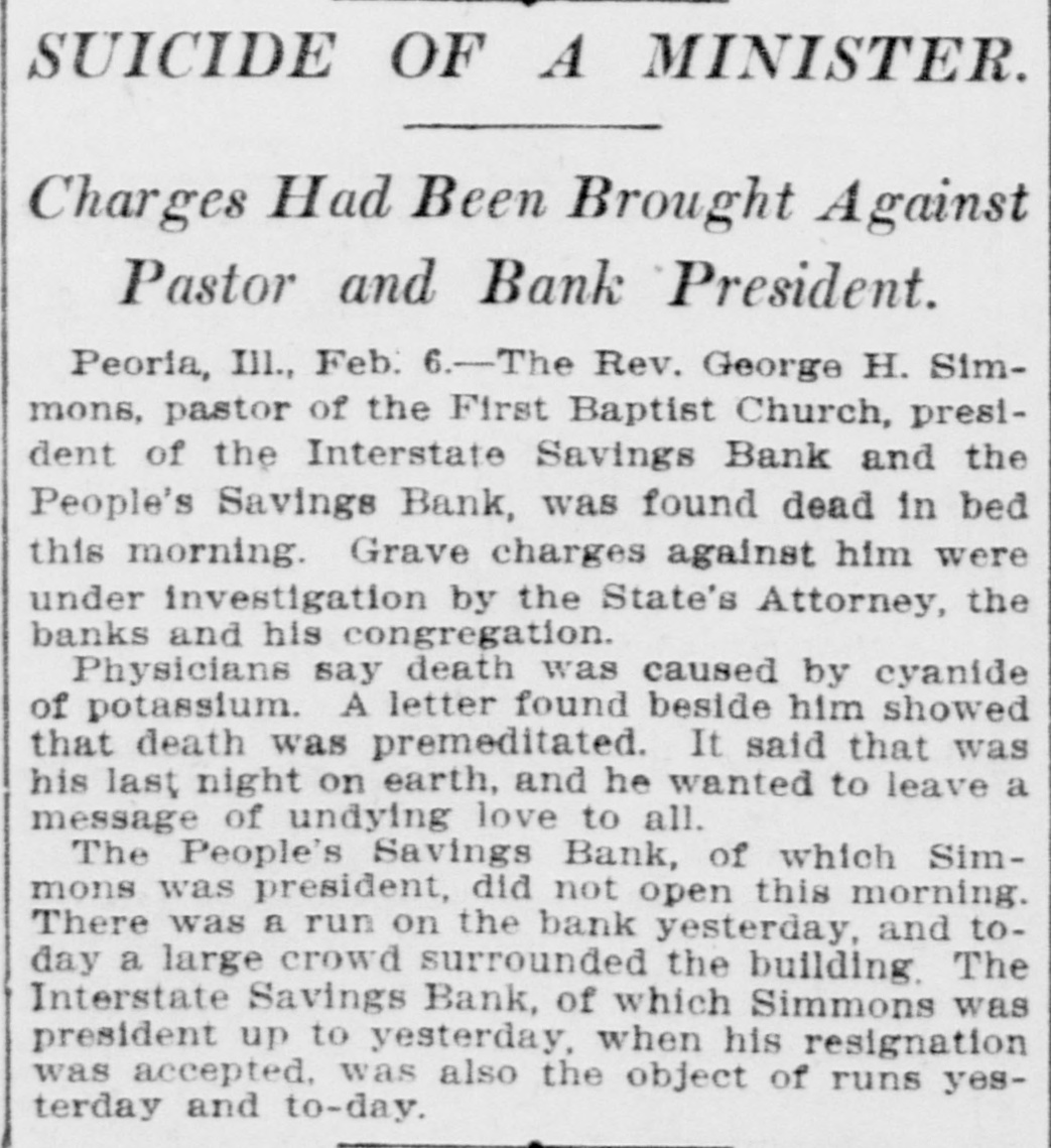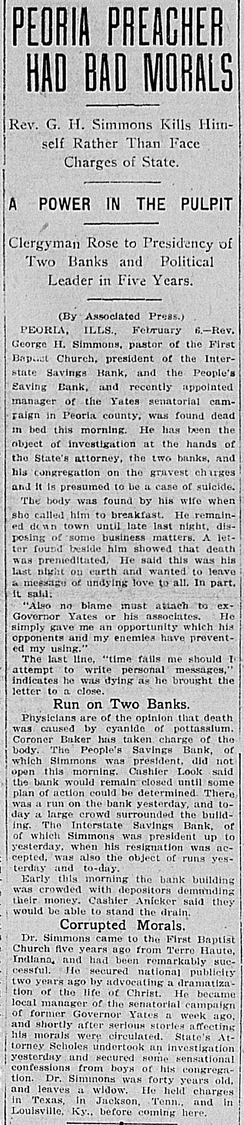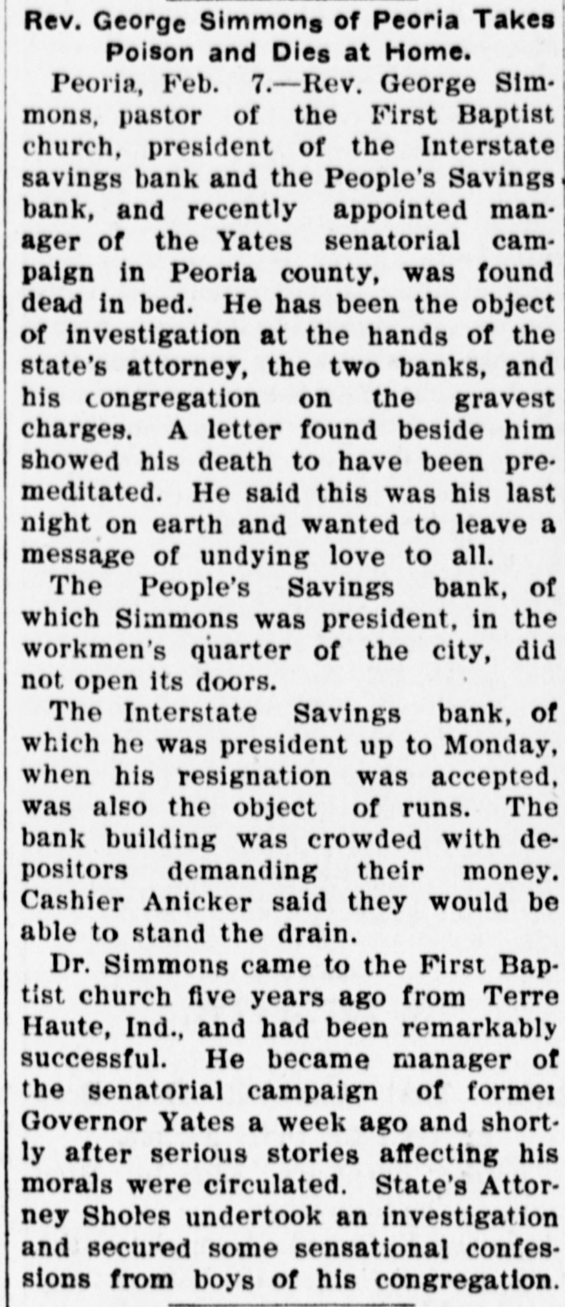 YATES MAN SUICIDES Rev. George H. Simmons, of Peoria, III., Found Dead in Bed This Morning--Grave Charges Made Against Him by State's Attorney, Two Banks and His Congregation. Peoria, Ill., Feb. 6.-Rev. George H. Simmons, pastor of the First Baptist church, president of the Interstate Savings Bank, and People's Savings Bank, and recently appointed manager of the Yates senatorial campaign, in Peoria county, was found dead in bed this morning. He has been an object of investigation at the hands of the state's attorney, two banks, and his congregation, on the gravest charges, and it is presumed that it is a case of suicide. The body was found by his wife when she called Simmons to breakfast. The letter found beside him showed death had been premeditated. He said this was his last night on earth and he wanted to leave a message of undying love to all. In part, it said: "Also no blame must attach to exGovernor Yates nor his associates. He simply gave me an opportunity, which his opponents and my enemies have prevented my using." The last line, "That time fails me should I attempt to write a personal message," indicates he was dying as he brought this letter to a close. Three physicians who were hastily summoned, are of the opinion his death was caused by cyanide potassium. Coroner Baker has taken charge of the remains. The People's Savings Bank, of which Simmons was president in the workingmen's quarter of the city, did not open its doors this morning. Cashier Look said it would remain closed until some future action was determined on. There was a run on the bank yesterday and this morning a large crowd surrounded the building clamoring for their money. The Interstate Savings Bank, of which Simmons was president up to yesterday, when his resignation was accepted, and E. C. Heidrich elected in his stead, was also the object of runs yesterday and today. Early this morning the bank building was crowded with depositors demanding their money. Cashier Anicker said they would be able to stand the drain. Simmons came to the First Baptist church five years ago from Terre Haute, Ind., and had been remarkably successful. He secured national publicity two years ago, by advocating a dramatization of the life of Christ. He became local manager of the senatorial campaign of former Governor Yates a week ago, and shortly after stories affecting his morals were circulated. States Attorney Scholes undertook an investigation yesterday, and secured some sensational confessions from boys of his congregation. Dr. Simmons was 40 years of age and leaves a widow.