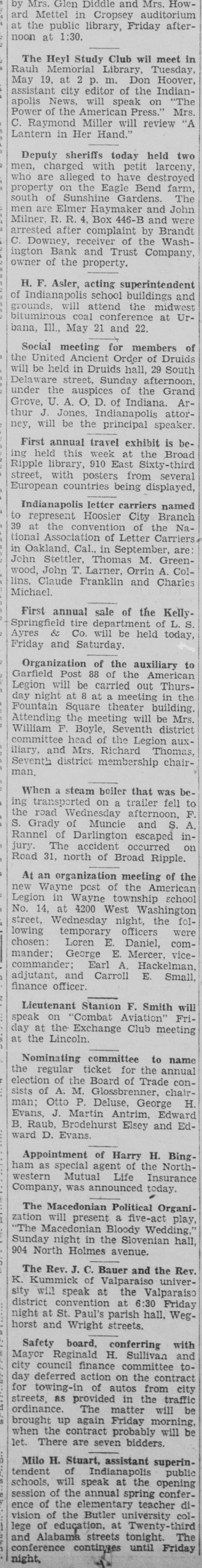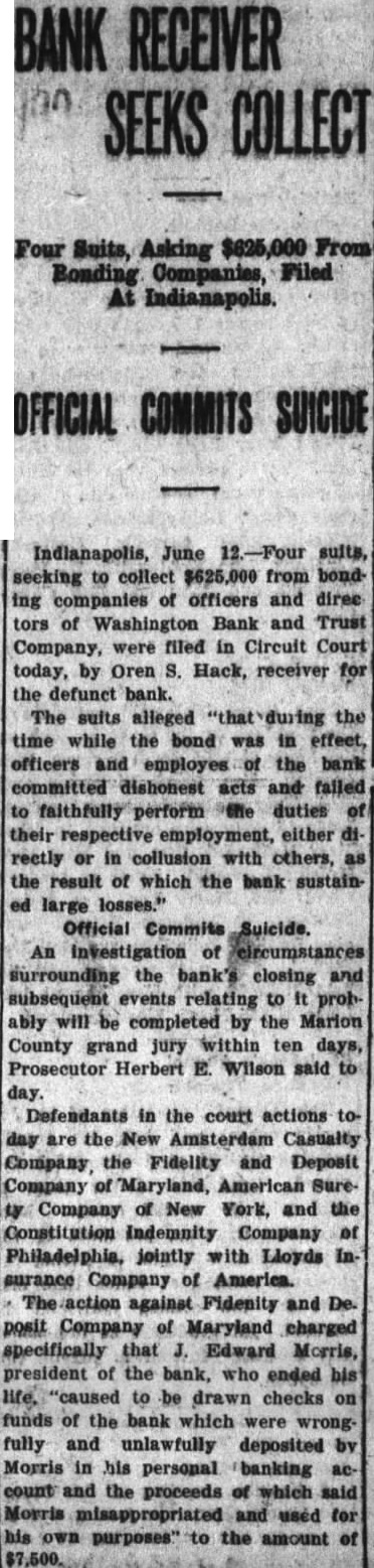 CLOSE WASHINGTON BANK TO STOP DEPOSITOR LOSS Officials Call for State Liquidation After Heavy Run Monday Perils Institution. For the announced purpose of the institution's doors this morning saving its depositors and stockholdand voluntarily placed its affairs in ers from loss, directors of the Washthe hands of Luther F. Symons, state bank commissioner. ington Bank and Trust Company, 255 West Washington street, closed Heavy withdraws Monday caused the closing, J. Edward Morris, president, declared in a statement, saying: insville "At the close of business Monday, Oct. 27, 1930, the directors of the Washington Bank and Trust Company canvassed the situation occasioned by the heavy withdrawal of City Men deposits during the day, and after careful consideration of the interests of the depositors, voluntarily decided to call upon the state banking department to take charge of the property and affairs of the bank." 7th 1929 Directors in Special Session The resolution adopted unanimously by directors in special meeting Monday night declared: "Resolved by the board of directors of the Washington Bank for Cost and Trust Company that owing to the heavy and unusual withdrawals of deposits Monday, Oct. 27, 1930, it is decided expedient that the Washington Bank and Trust Company in order to save its depositors and stockholders from loss, should Rishard go into voluntary liquidation, and that the state bank department be asked to take charge of property Jacob Van, Morgan county farmers and affairs of the company to effect arrested with the Indianapolis men, such liquidation, effective at the were released without paying fines close of business Monday evening, and costs. Oct. 27, 1930." Diligent search of the Morgan Thomas D. Barr, assistant state county court records show no entry bank commissioner, took personal of a trial or hearing for those who charge of the institution this paid the fines and costs. morning. It is pointed out by Morgan Assets Near Eight Million county residents that this affair is on a par with what occurred three Capitalized at $200,000, the Washweeks ago when the Checkerboard ington Bank and Trust Company lunch stand on the Bloomington on its last report to the state, road burned. showed assets of $7.970.977,25, loans More than one hundred bottles of of approximately $1,500,000, deposits beer and liquor were guarded by the of approximately $2,290,000 and a police while the firemen battled the surplus and undivided profits of blaze. $88,824.59. No attempt was made by the sherState deposits of $200,000 were in iff to seize the beer or liquor while the bank, Frank Richards, deputy the owner of the place, whose idenstate treasurer disclosed today. Of tity was unknown, sought to sell the this amount $150,000 is bonded. Officers, besides Morris, are Clifintoxicants to passers-by. ton N. Fields, vice-president; FranThe affair was reported to the prosecutor, W. G. Bray, who laughed cis W. Payne, vice-president and trust officer: William T. Pearcy, about it. Comment and criticism secretary; Calvin J. Clymer, assistbecame so strong that the next day ant secretary; Petrache Velesscu, Bray issued a warrant, but the assistant secretary-treasurer. owner had fled.