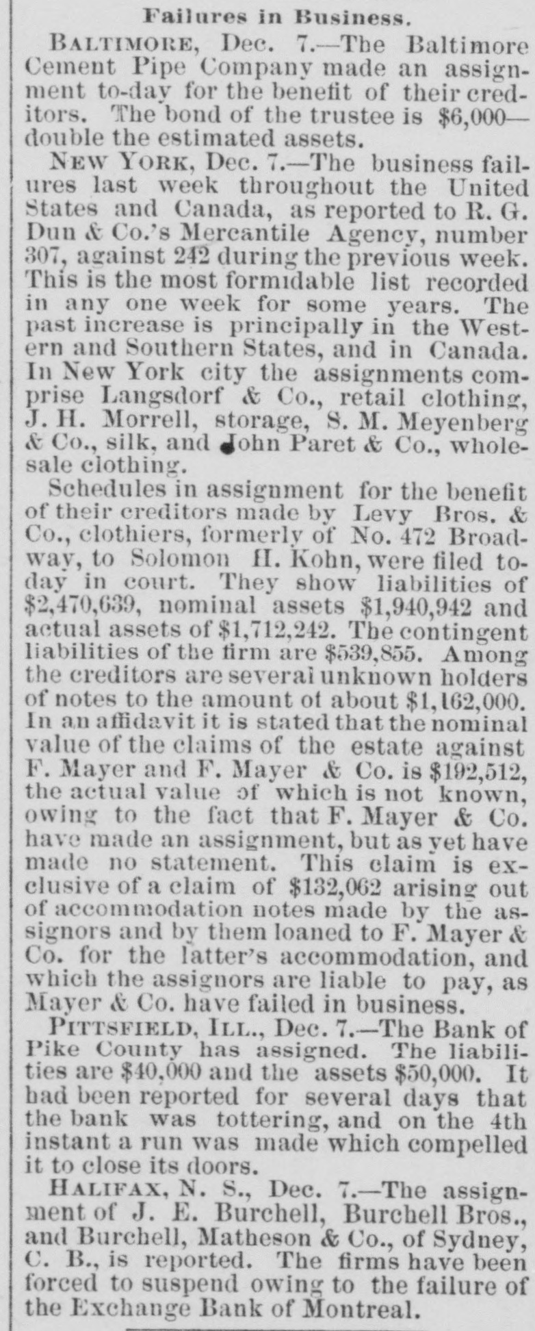 Deeds of Blood. Frank Steve Thomas, a gambler, committed suicide at Galveston, Texas, on the 8th, by taking launanum. A young man named Charles Gardner shot himself at Douglass Park, Chicago, on the 9th. Grief over a young lady who committed suicide out of love for him turned his brain. Francis J. Parmenter, a Providence, R. I. coal dealer, was found dead in his barn on the 9tb, his skull being fractured. John Martin and Joseph F. Bree, whites, and Thomas Harket, colored, have been arrested on suspicion. James M. Underwood was hanged at Dardelles, Ark., on the 7th inst., in the presence of 3,000 people, for the murder of Robert J. Pendergrass several months ago. Jacob Wagen. a Milwaukee butcher, in a fit of the blues caused by a bad attack of delirium tremens, shot himself in the left side on the 7th inst., and died the same day. Two farmers named Johnson and Hawkins, living near Anderson, Ind., quarreled about a ditch on the 5th, and the latter shot Johnson and then committed suicide. Green Miller, a wife beater was fatally shot by a policeman at Danville, Va., on the 4th. Patrick Johnson, convicted of the murder of Michael Holmes, in Milwaukee in February last, has been sentenced to twenty years in Waupun. Thomas Salmon, the man under arrest at Laconia, N. H., for the murder of Mrs. Ford and Mr. Ruddy and child, broke down on the 3d and made a full confession of the crime. Financially Embarrassed. Failures in the United States and Canada for the week ending on the 7th inst., 807; for he previous week, 242. The Dover Silk Company, of Paterson. N. J., failed for $102,000 on the 6th. The mills employed 150 hands. The bank of Pike County, at Pittsfield, Ill., made an assignment on the 5th. Liabilities not known. Coates Bros., proprietors of a rolling mill near Baltimore, have failed for $75,000. Jones. Lamson & Co., proprietors of the Ascutney Mills, Windsor, Vt., who failed for $500,000 last August, have settled with their creditors and the works will soon be running. Aeppli & Mattsen, tanners, Chicago, made made an assignment on the 4th inst. They owe $30,000. The firm of Cameron & Moreau. dry goods, Chicago, were closed up by the sheriff on the 4th, under judgments confessed to the amount of $28,231. Coates & Brother, proprietors of the Locust Point Rolling Mills, Baltimore, railed on the 4th. Liabilities about $75,000. Smoke. Fire at the Mount Hickory Rolling Mills, Erie, Pa., on the 9tb, caused a loss of $200,000, and threw 250 men out of work. The Union Roiling Mill at Cleveland, Ohio, was partially burned on the 9th, causing a loss of $70,000. The Annisquam Mill, Rockport, Mass, burned on the 9tb. Less $200,000. The Athens Worsted Millsat Millbury, Mass., burned on the 8th. Loss es'imated at $100,000. Marlboro, Mass., suffered to the extent of block. $30,000 on the 7th by the burning of the Corry A sleeping car burned near Castleton. N. Y., on jured. the 7th. Two passengers were badly inA portion of the Sinclair packing house, at Cedar Rapids, Iowa, was partially destroyed by fire on the 7th, involving a loss of $100,000. The fire at Brussels, Belgium, on the 6th inst., caused a loss of 12,000,000 roubles. Fire on the 7th almost totally destroyed the town of Williamston, N. C.. together with the steamer Commerce, of the Roanoke and Baltimore Line, and 200 bales of cotton. Loss not given. A Presbyterian Church at Kalamazoo, Mich., burned late on the night of the 5th. Loss $25,000. The wholesale drug store of Haswell & Co., Montreal, burned on the 5th. Loss $50,000. The woolen mills of J. W. Sinclair, at Sa. lem, Ind., were destroyed by fire on the 6th, involving a loss of $75,000. The wholesale drug house of Pendleton. Thomas & Co., Nashville, Tenn., burned on the 5tb. Loss $75,080. The flaxseed oil mill of Rhodehammel Bros., Tippecanoe, O.. burned on the 5th, involving a loss of $40,000. The Moore and McCrary block, at Atlanta, Ga., was destroyed by fire on the 4h. The loss is estimated at $40,000. The steamer Minnie burned at Green Bay, Wis., on the 4th inst. Loss $15,000 The agricultural implement works of W. E. Whitman, at Winthrop, Me., burned on the 4tb. Loss $30,000. Three stores and the railroad depot at Sadiga, Alabama. burned on the evening of the 3d. Loss $75,000. Fire at Lynchburg, Tenn.. on the 4th inst., destroved twenty-two houses, including the Sentinel office and several stores. Loss $35,090. Fire at Liverpool, Eng., on the 3d inst., destroyed several cotton warehouses. The losses aggregate £60,000. A dozen store buildings at Chiliicothe, Mo.. burned on the 3d inst., involving a loss of $20,000. Governor's building, one of the largest blocks at Burlington, Iowa, burned on the 3d inst., involving a loss of $50,000. Adolph Heller's sausage factory, at Milwaukee. was partially burned on the 3d inst. Loss $15,000. The steamer Fred Debary was damaged to the extent of $60,000 by fire at Jacksonville, Fla., on the 3d inst. Watson, Obert & Co.'s general store at Bancroft, Mich., was damaged by fire to the extent of $15,000. Minor Mention. A man and three children were drowned by the cansizing of skiff while