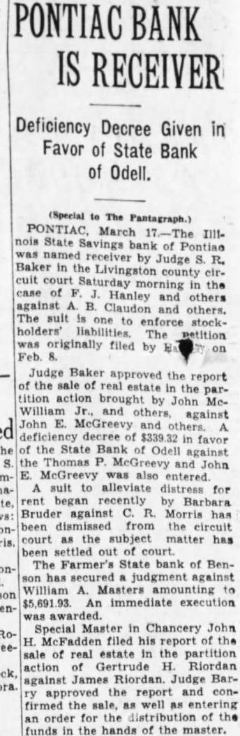 Livingston County Court Proceeding. Illinois State Savings bank, Raymond Grover ceiver, vs. confession Four Arrested. Irene Hadner, aged Jean aged 17; Kenneth DonaldFleming, and Robert son, aged 13, of Peoria, were picked Dwight by State Officer Logan Ketcham and later turned over to Sheriff Scarquartet detained the in Pontiac Monday when an officer from the juvenile court Peoria arrived returned them to that HE Before further, make you