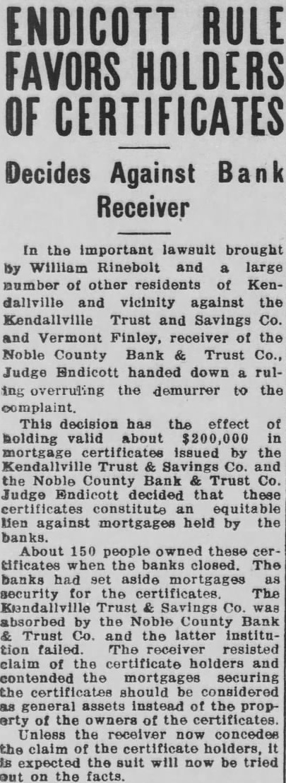 ENDICOTT RULE Decides Against Receiver In the important lawsuit brought by William Rinebolt and large number of other residents of Kendaliville and vicinity against the Kendallville Trust and Savings Co. and Vermont Finley, receiver of the Noble County Bank Trust Co., Judge Endicott handed down overruling the demurrer to the complaint. This decision has the effect holding valid about mortgage certificates issued by the Trust Savings and the Noble County Bank Trust Co. Judge Endicott decided that these certificates constitute equitable against mortgages held by the banks. About people owned these tificates when the banks closed. The banks had set aside security the The Trust was absorbed by the Noble County Bank Trust and the institution failed. The resisted claim the certificate holders and contended mortgages securing the certificates should considered general assets instead of the property of the owners of the the receiver concedes claim the certificate holders, expected the suit will now be tried on the facts.