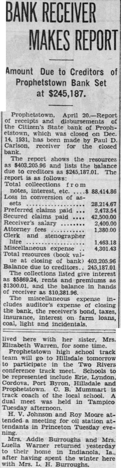 BANK Man to Settle Affairs of Closed Prophetstown Institution. Prophetstown, Jan. receiver of the closed Citizens' State bank of yesterday Paul of hotel there, began duties this John M. Stager, county lawyer, appointed as the receiver's torney. Mr. Carlson has been secretary republican central committee Whiteside county the last two years. He also has been member the county board of review two years. He selected Taber, cashof the closed bank, as his sistant. The building will opened in week or ten days, Mr. Carlson said, so that persons having valuables in deposit boxes may access to Depositors of the bank have pointed to act them in working with the receiver. Greene, Ralph McGrady and Zschiesche.