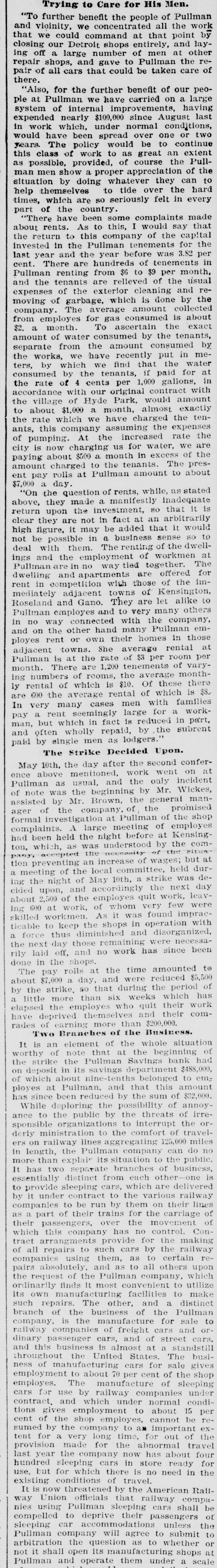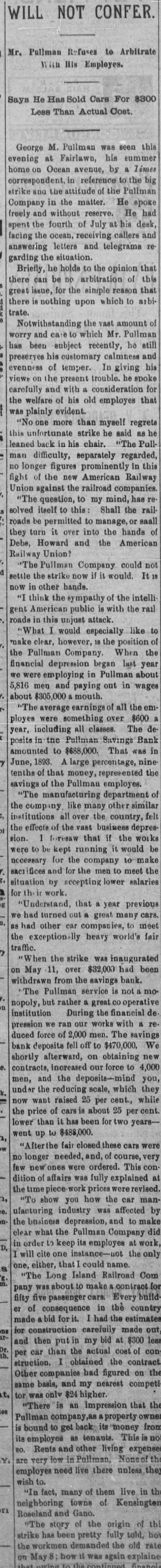 WILL NOT CONFER. Mr. Pullman Refuses to Arbitrate With Ilis Employes. Says He Has Sold Cars For $300 Less Than Actual Cost. George M. Pullman was seen this evening at Fairlawn, his summer home on Ocean avenue, by a Times correspondent, in reference to the big strike and the attitude of the Pullman Company in the matter. He spoke freely and without reserve. He had spent the fourth of July at his desk, facing the ocean, receiving callers and answering letters and telegrams regarding the situation. Briefly, he holds to the opinion that there can be no arbitration of this great issue, for the simple reason that there is nothing upon which to arbitrate. Notwithstanding the vast amount of worry and care to which Mr. Pullman has been subject recently, he still preseryes his customary calmness and evenness of temper. In giving his viewe on the present trouble. he spoke carefully and with a consideration for the welfare of his old employes that was plainly evident. "No one more than myself regrets this unfortunate strike he said as he leaned back in his chair. "The Pullman difficulty, separately regarded, no longer figures prominently in this fight of the new American Railway Union against the railroad companies. "The question, to my mind, has resolved itself to this: Shall the railroads be permitted to manage, or saall they turn it over into the hands of Debs, Howard and the American Railway Union? "The Pullman Company could not d settle the strike now if it would. It 18 now in other hands. "I think the sympathy of the intelligent American public is with the rail roads in this unjust attack. "What I would especially like to make clear, however, 18 the position of the Pullman Company. When the financial depression began last year we were employing in Pullman about 5,816 men and paying out in wages about $305,000 a mouth. "The average earnings of all the employes were something over $600 a year, including all classes. The deposits in the Pullman Savings Bank amounted to $688,000. That was in June, 1893. A large percentage, ninetenths of that money, represented the savings of the Pullman employes. "The manufacturing department of the company. like many other similar institutions all over the country, felt 1 the effects of the vast business depression. I foresaw that if the works were to be kept running it would be necessary for the company to make sacrifices and for the men to meet the situation by accepting lower salaries for the ir work. g "Understand, that a year previous we had turned out a great many cars. as had other car companies, to meet the exceptionally heavy world's fair traffic. "When the strike was inaugurated on May 11, over $32,000 had been withdrawn from the savings bank. "The Pullman service is not a monopoly, but rather a great CO operative n institution During the financial de pression we ran our works with a re. duced force of 2,000 men. The savings bank deposits fell off to $470,000. We shortly afterward, on obtaining new e. contracts, increased our force to 4,000 men, and the deposits-mind you, under the reducing scale, which they now want raised 25 per cent., while the price of cars is about 25 per cent. lower than it has been for two yearswent up to $488,000. "Afterthe fair closed these cars were